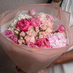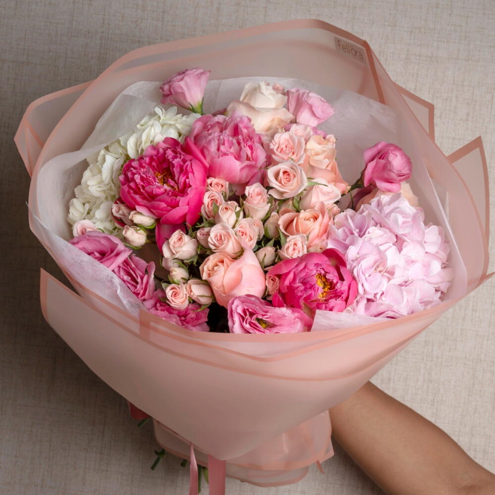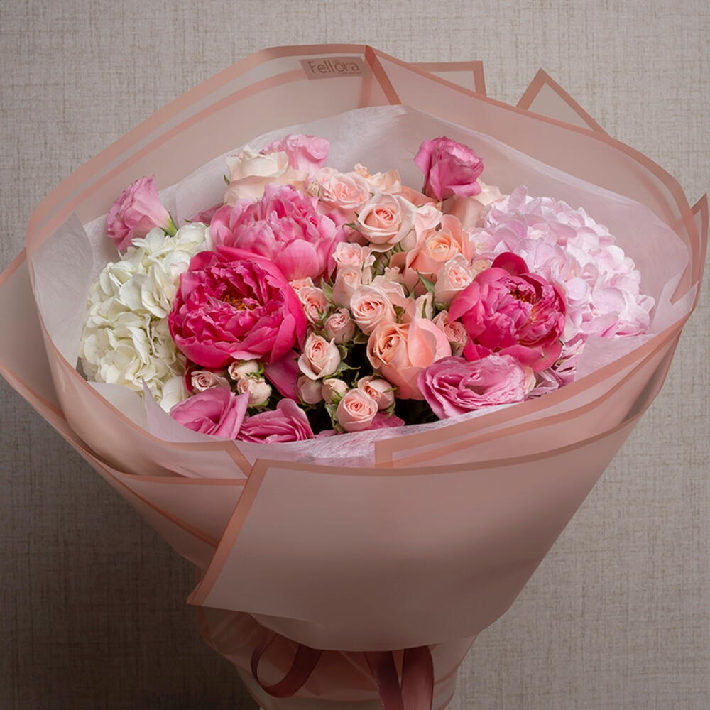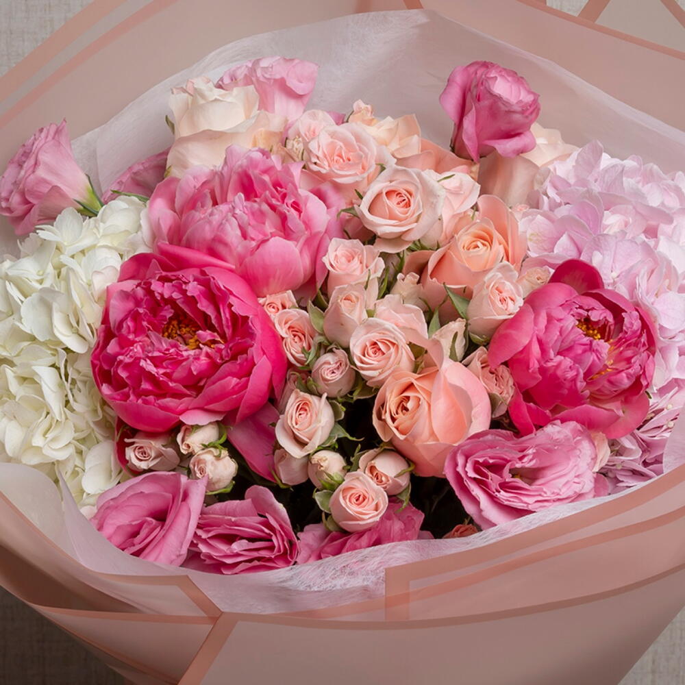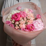 pink eustoma - 4 шт. ribbon satin - 1 шт. coral charm peonies - 3 шт. wrapping paper - 4 шт. white hydrangea - 1 шт. Свит Сара кустовая роза - 10 шт. розовая гортензия - 1 шт.