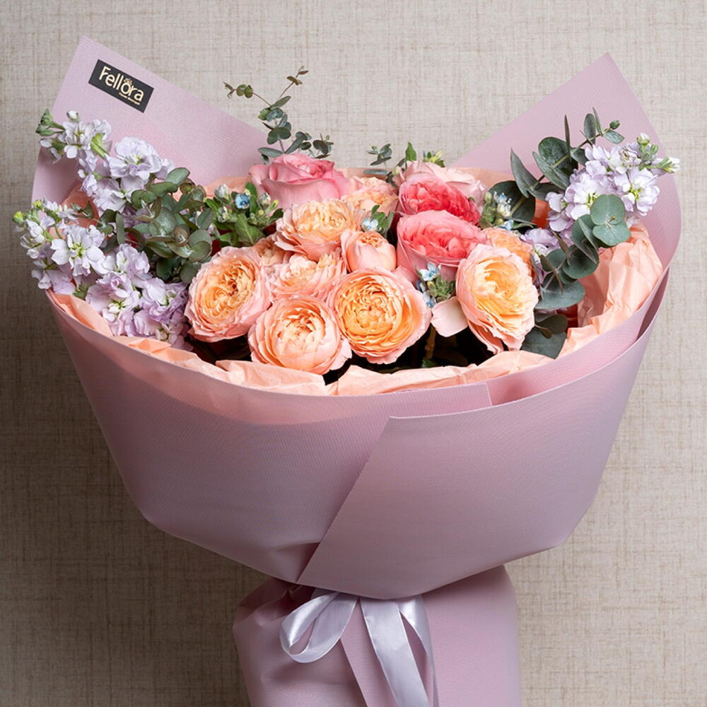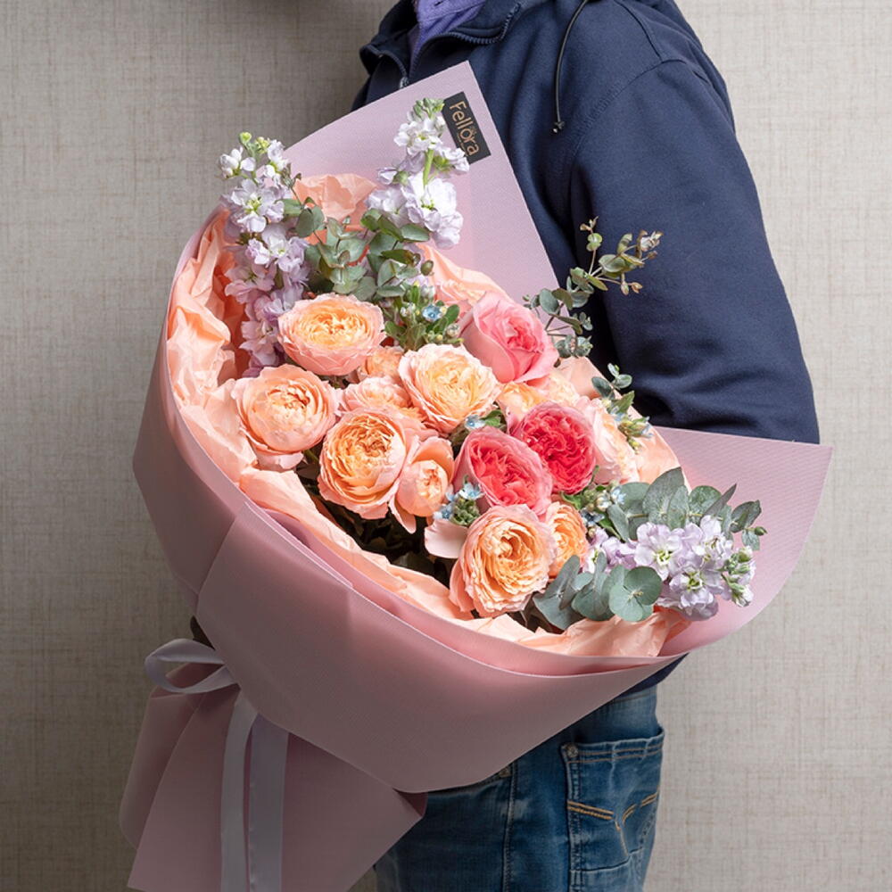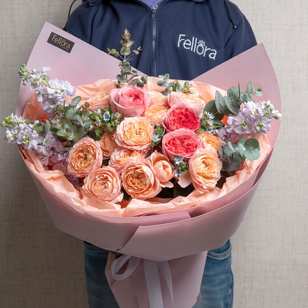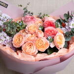 ribbon satin - 1 шт. oxypetalum - 3 шт. eucalyptus leaves - 3 шт. маттиола светло-фиолетовая - 3 шт. розовая роза садового сорта "Экспрессия" - 3 шт. пионовидные розы джульетта - 4 шт. украшение упаковки - 3 шт.