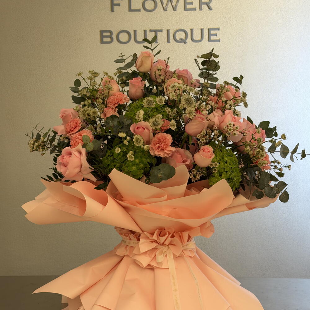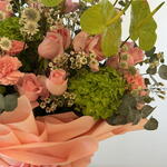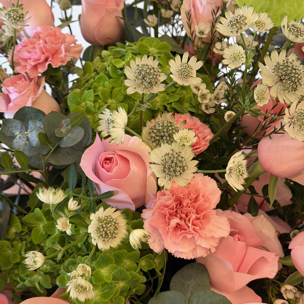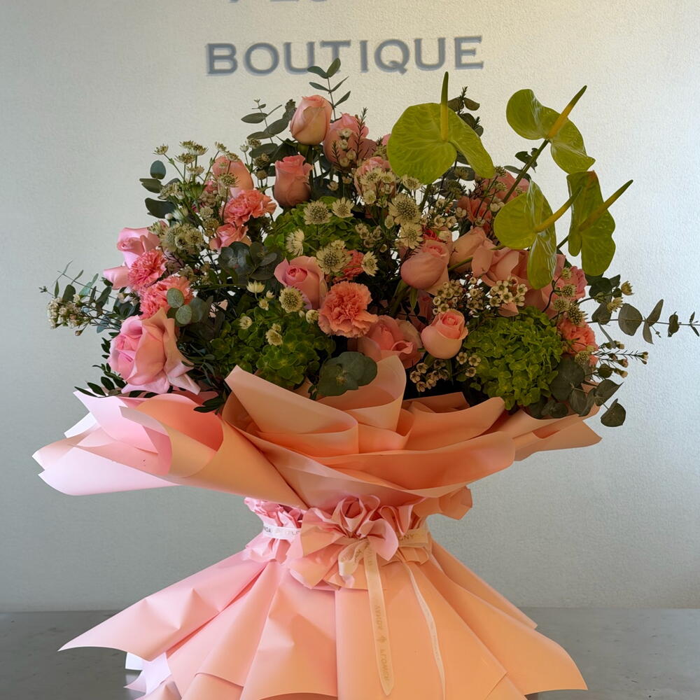 Pink rose - 20 шт. Антуриум - 4 шт. Leaves - 7 шт. wax - 5 шт. зелёная гортензия - 3 шт. астерентия - 5 шт.