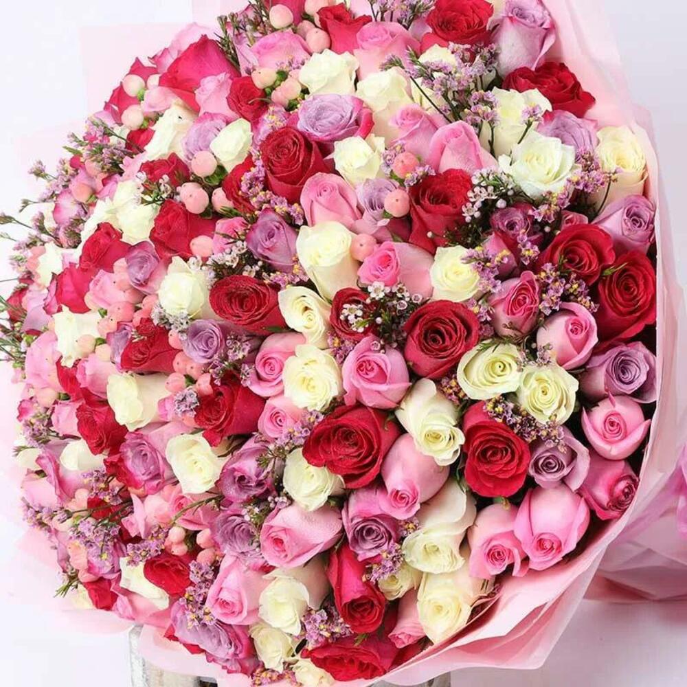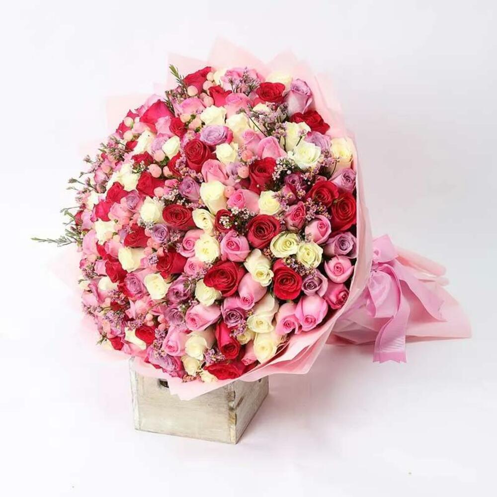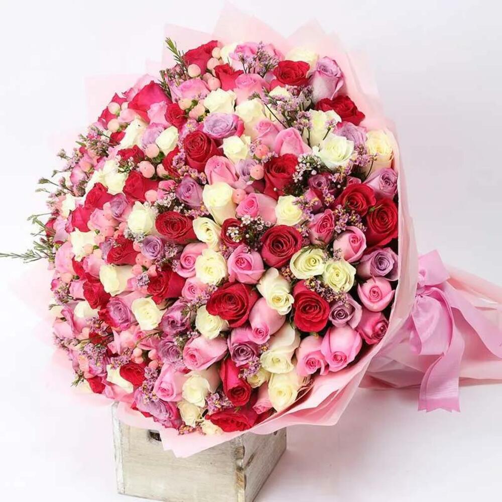 Информация о товаре: 40 белых роз 40 розовых роз 40 фиолетовых роз 30 темно-розовых роз 10 розовых гиперикумов 5 стеблей фиолетовых восковых цветов 5 розовых лимониумов Розовая упаковка и бант из ленты Инструкция по уходу: После получения букета снимите упаковку и дайте им немного подышать. Как рекомендуется, обрежьте стебли примерно на 2,5-5 см под углом 45 градусов. Удалите все листья ниже уровня воды и поместите цветы в чистую водопроводную воду. Обрезая листья, удалите листья ниже уровня воды, но не удаляйте все листья по всей длине стебля. Как рекомендуется, каждые 24 часа обрезайте стебли примерно на 1-2 см от основания и меняйте воду на свежую. Не ставьте цветы под прямые солнечные лучи или вблизи источников чрезмерного тепла. Не ставьте цветы под вентилятор или кондиционер. Если лепестки или листья увяли, удалите их. Ежедневное опрыскивание водой поможет получить максимальную пользу от цветов. Следуйте рекомендациям по уходу и любите свои цветы!