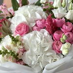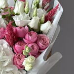 celosia - 3 шт. white hydrangea - 3 шт. eustoma pink - 4 шт. white roses - 10 шт. антуриум - 10 шт.