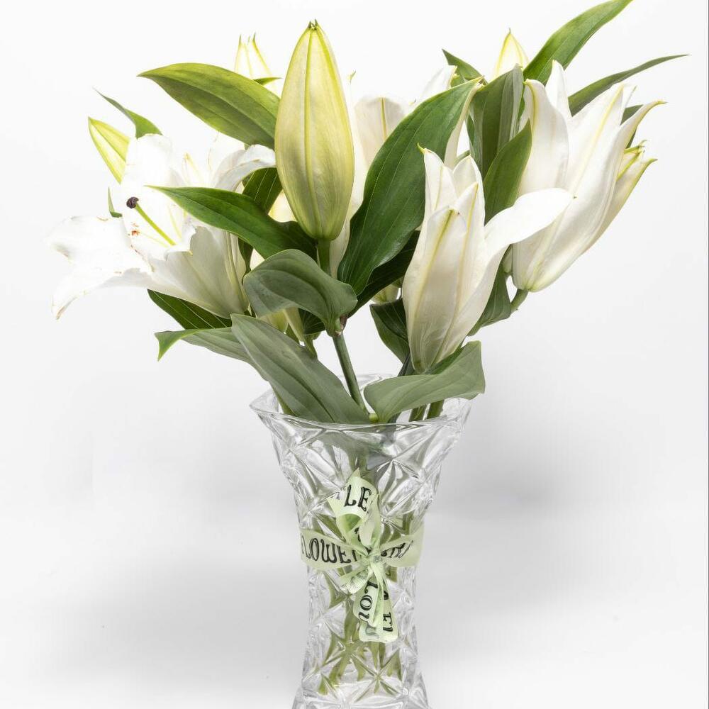 Эта потрясающая композиция включает 10 безупречных белых лилий - 1 шт. каждый тщательно оформлен в элегантной стеклянной вазе, чтобы создать простой, но утончённый вид. - 1 шт.