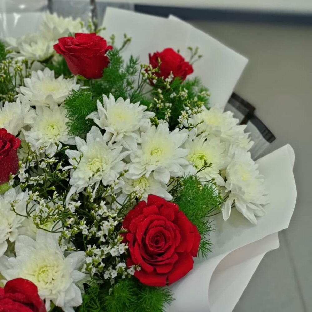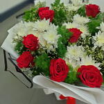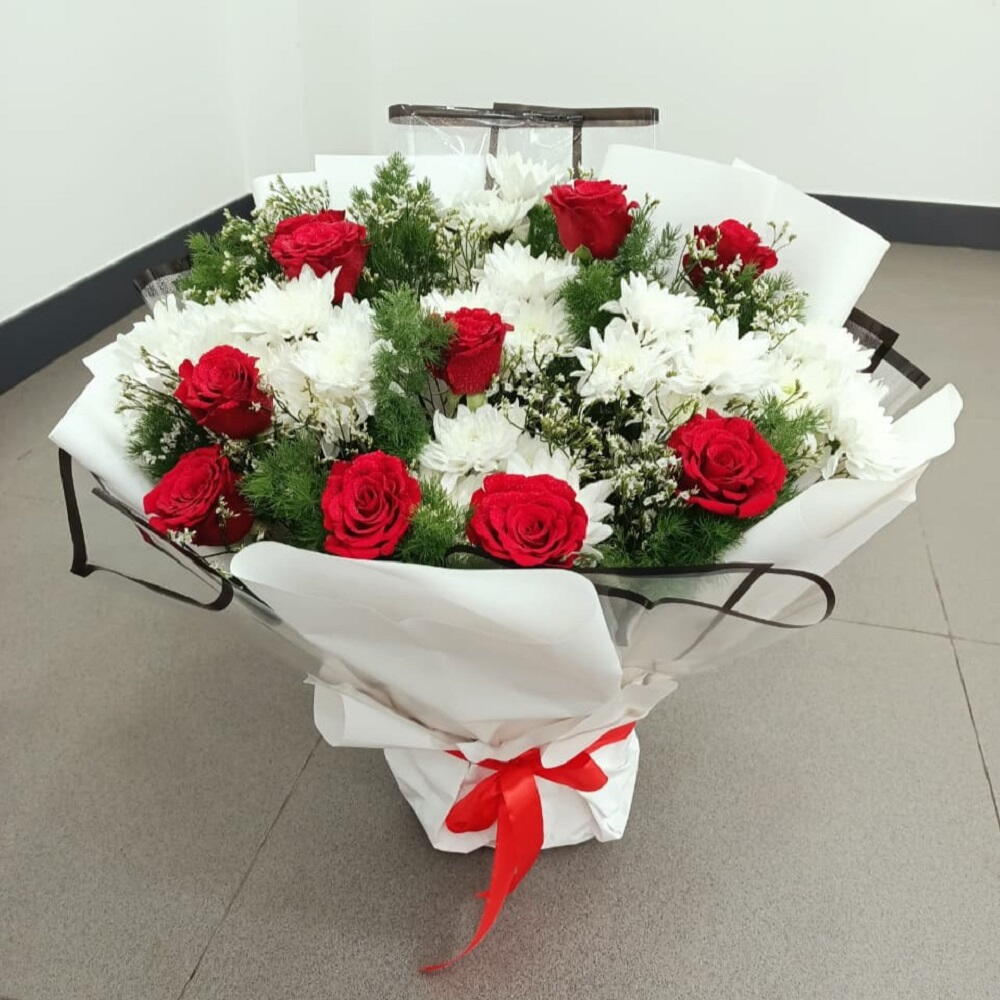 Эффектный, элегантный букет из темно-красных роз и пушистых белых хризантем, подчеркнутый изысканной зеленью и хрустящей оберткой из чисто-белой бумаги с ярко-красным атласным бантом.