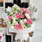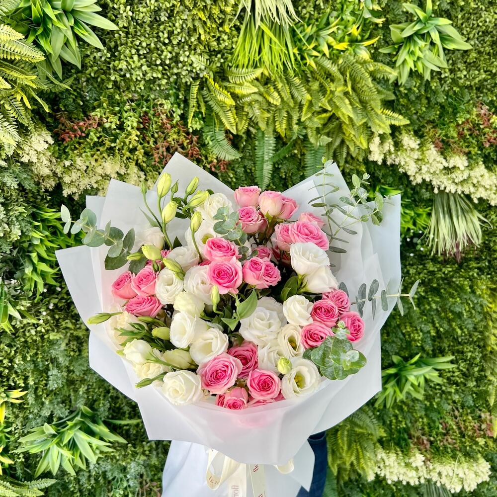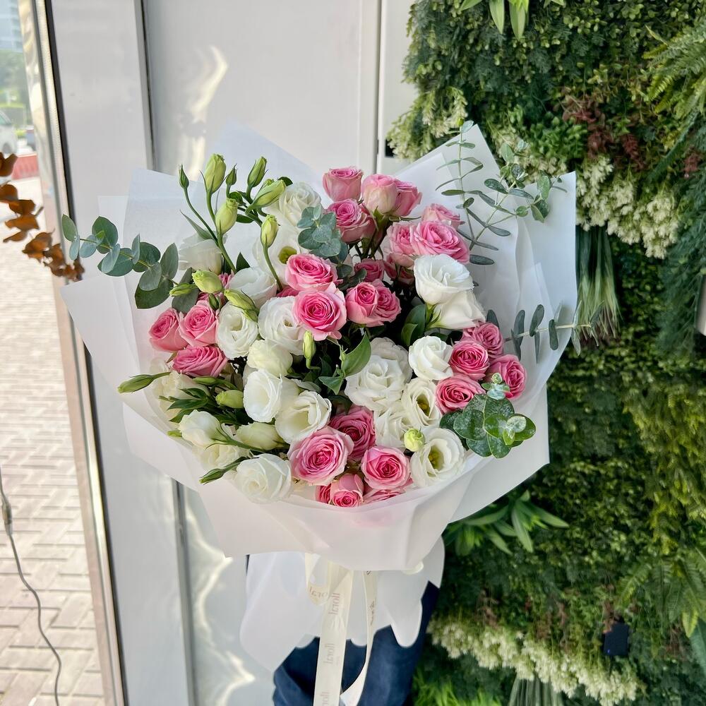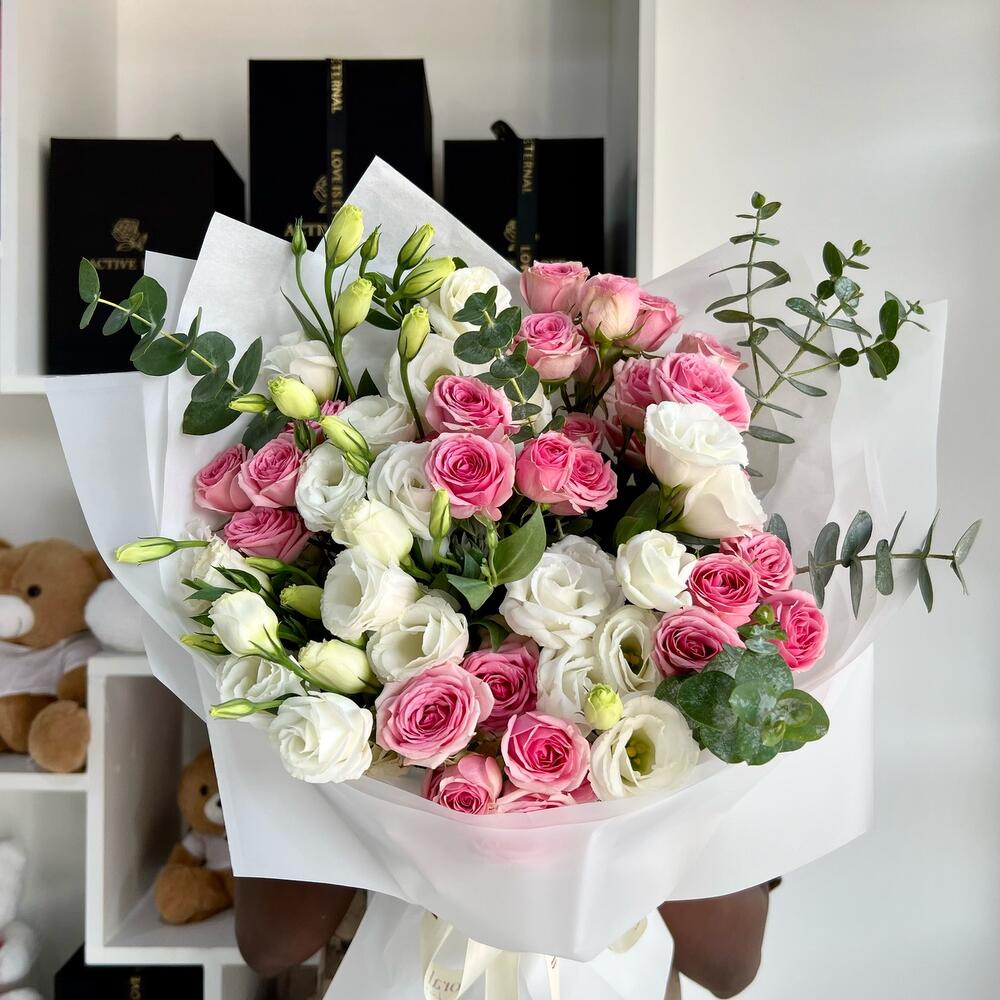 Эта очаровательная композиция включает семь белых лизиантусов и шесть нежных розовых кустовых роз, дополненных пышным эвкалиптом. Упакованная в нежную белую простыню, она станет идеальным подарком на день рождения, годовщину или просто чтобы сказать «мне не всё равно». Эта нежная и романтичная композиция также станет прекрасным сюрпризом для вашей девушки, чтобы показать ей, как много она для вас значит, самым прекрасным способом.