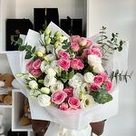 pink spray rose - 6 шт. white lisianthus - 7 шт. папиросная бумага - 1 шт. упаковочные листы с белым размытием - 5 шт. брендированная лента - 1 шт. эвкалипт - 1 шт.