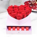 Описание товара: - 15 вечных красных роз 12 шт. шоколадных конфет в форме сердца от Sweecho упаковано в премиальную фиолетовую коробку в форме сердца с акриловой крышкой.