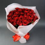 • 25 красных роз • Красиво упакованы в белую упаковку • Завязаны красным бантом