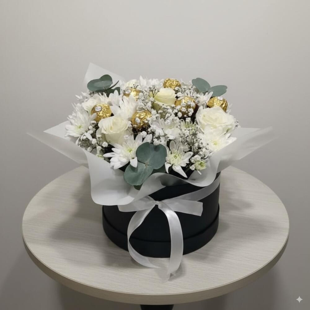 Box - 1 шт. Chrysanthemum - 2 шт. rose - 6 шт. baby breath - 2 шт. шоколад ferrero rocher - 6 шт.