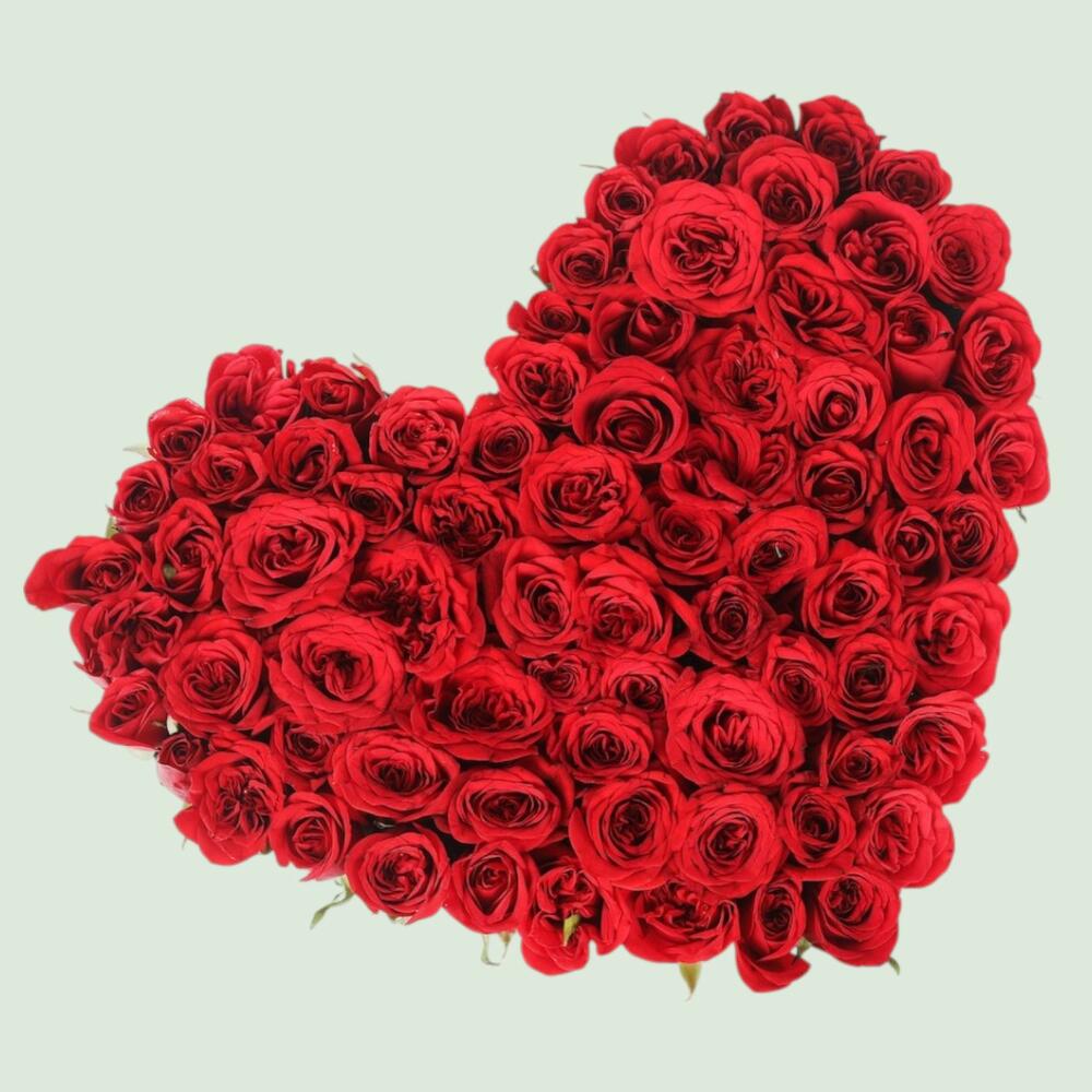 Роскошная и душевная композиция, тщательно выполненная в форме полного, яркого сердца, полностью состоящая из многочисленных насыщенно-красных роз. Это потрясающее и классическое оформление является воплощением глубокой любви и преданности. ( В композиции губка в форме сердца, покрытая обёрткой)