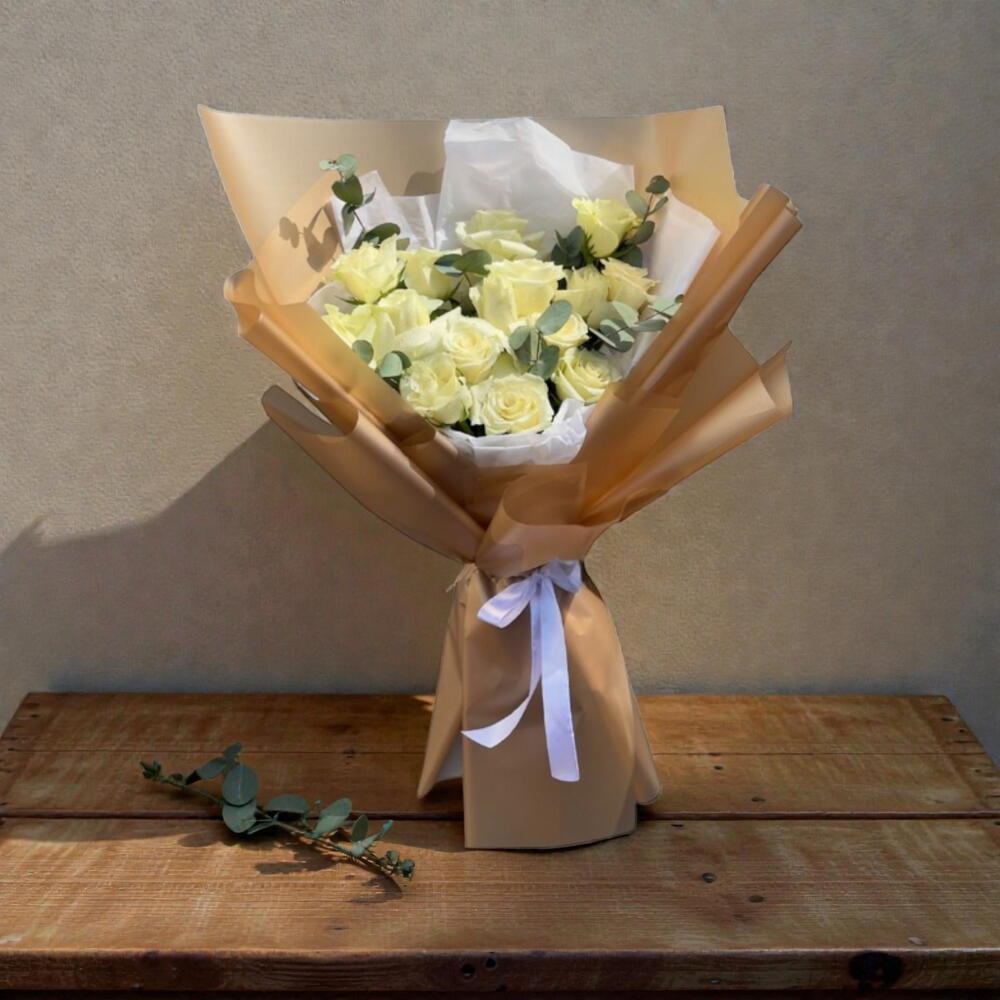 Eucalyptus - 2 шт. white ribbon - 1 шт. белая упаковочная бумага - 2 шт. white roses - 15 шт. коричневая упаковочная бумага - 2 шт.