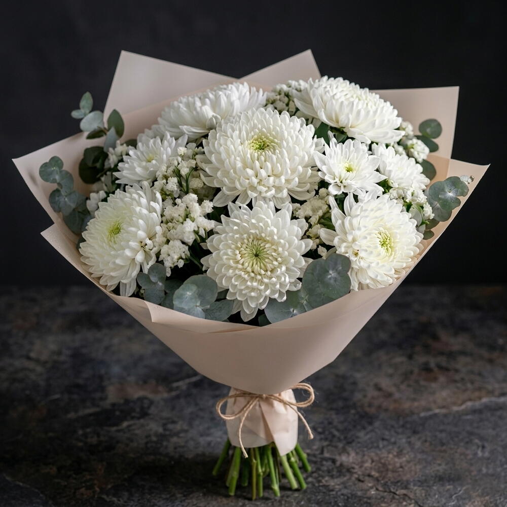 Honor Mom in the UAE with our Pure Serenity bouquet. A curated mix of 6 large white chrysanthemums, 4 delicate gypsophila stems, and 3 fresh eucalyptus branches in elegant paper. Same-day delivery across Dubai and Abu Dhabi. The perfect luxury Mothers Day gift to express pure love.