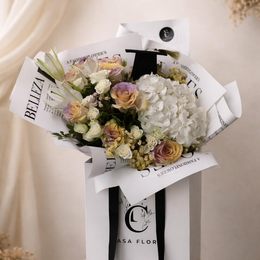 Роскошная пастельная цветочная композиция, представленная в фирменном белом подарочном пакете CASA FLOR. Букет включает мягкие розы цвета румянца и шампанского, кремово-белые гортензии, нежные спрей-розы, лилии и сезонные цветочные наполнители, упакованные в стильную бумагу в газетном стиле для современного, модного вида. Украшенная миниатюрной выпускной шапочкой, эта композиция — идеальный способ отпраздновать академические достижения со стилем и изяществом. Идеально подходит для выпускных, вех и искренних поздравлений