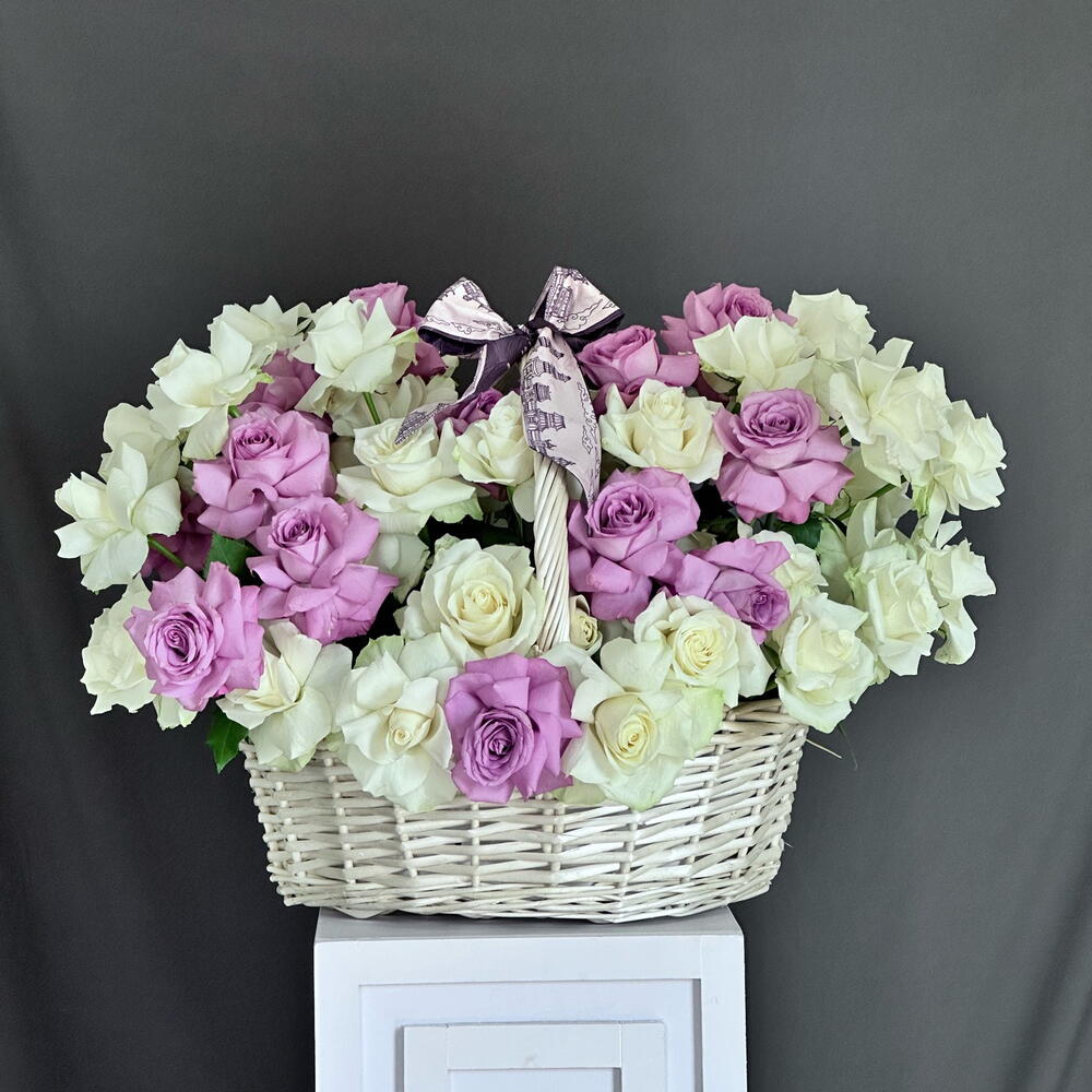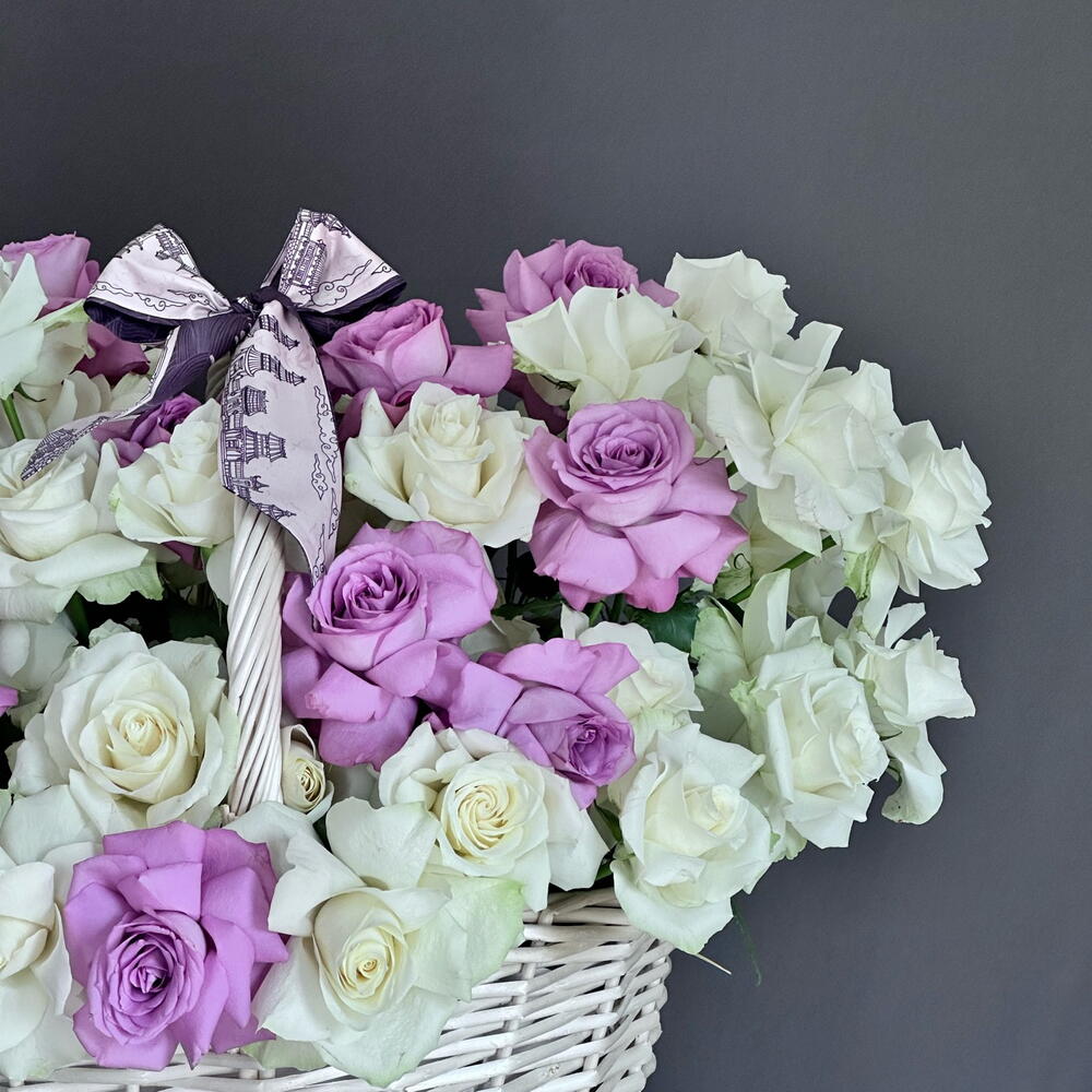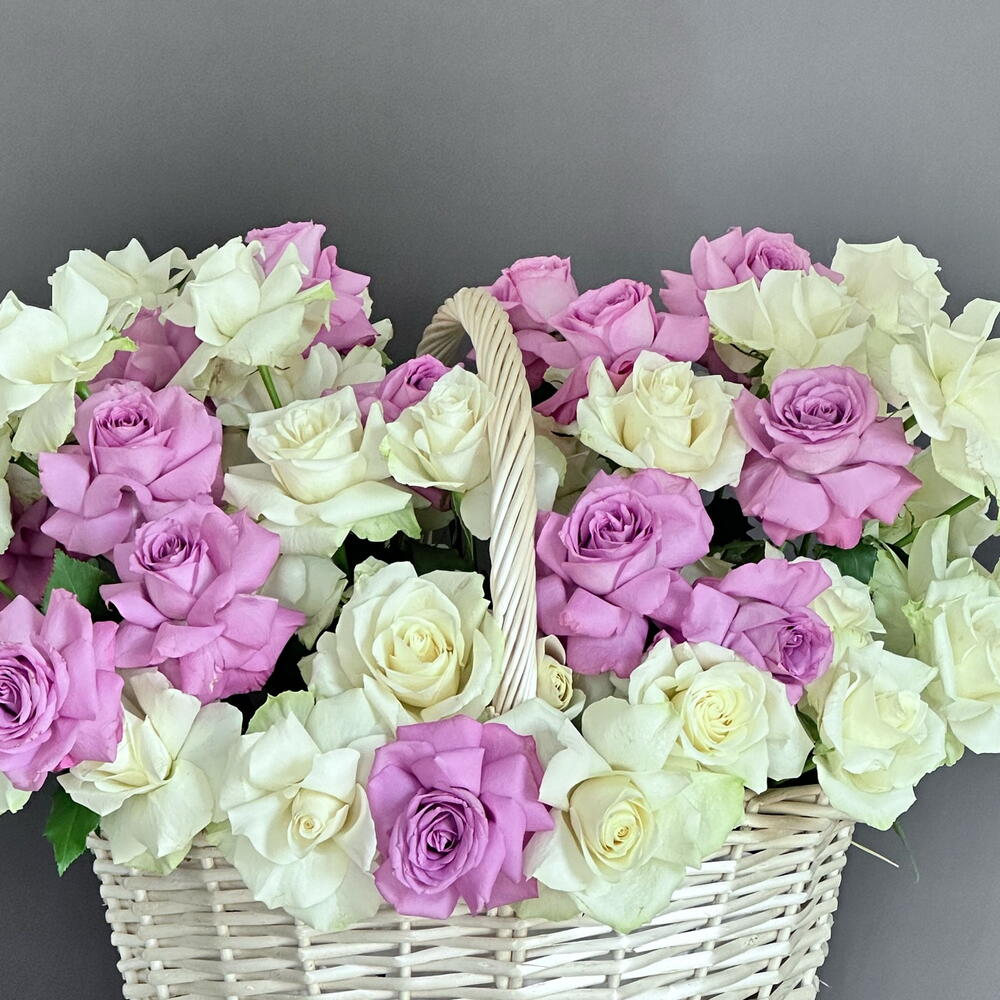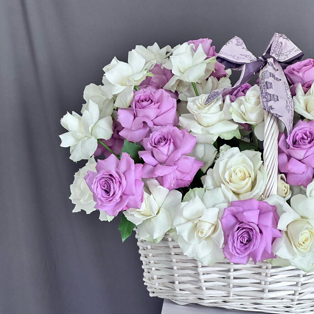 White rose - 26 шт. purple rose - 27 шт. большая корзина - 1 шт.