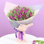101 фиолетовый тюльпан в серо-мраморной и розовой обертке, перевязанный фиолетовой лентой.