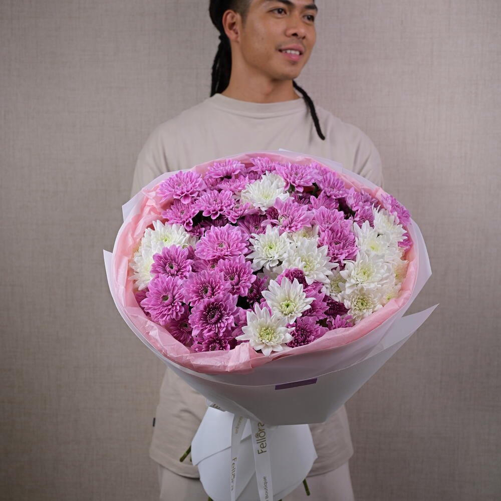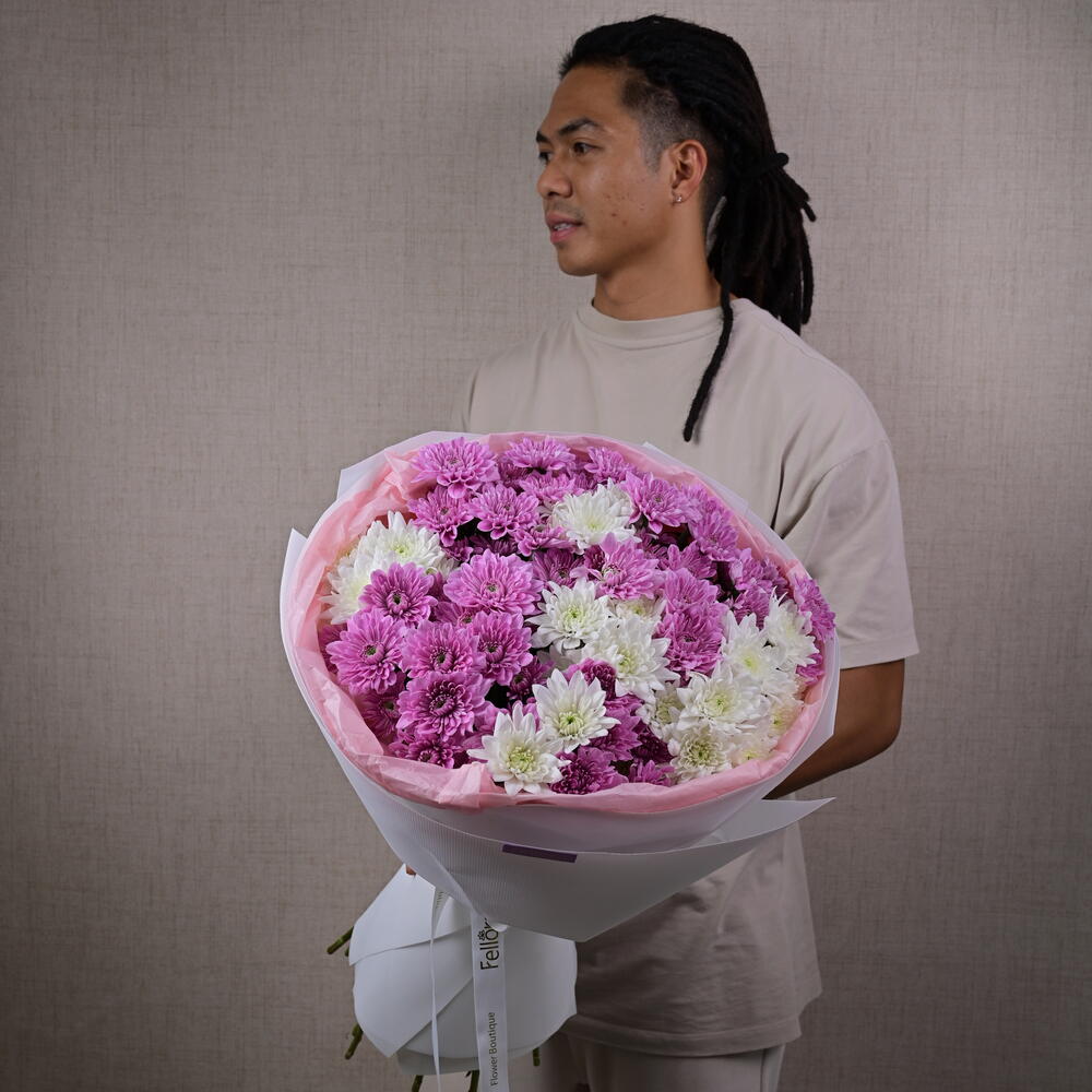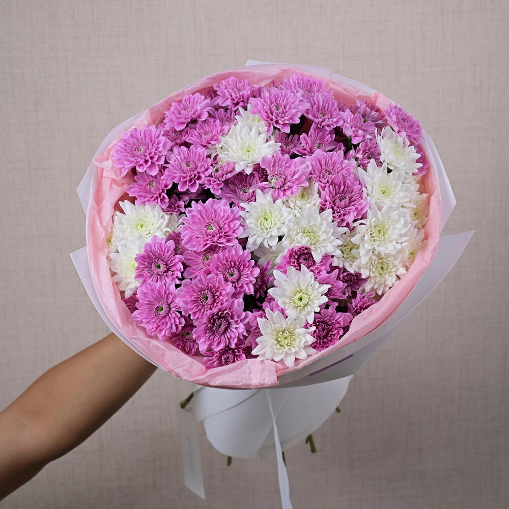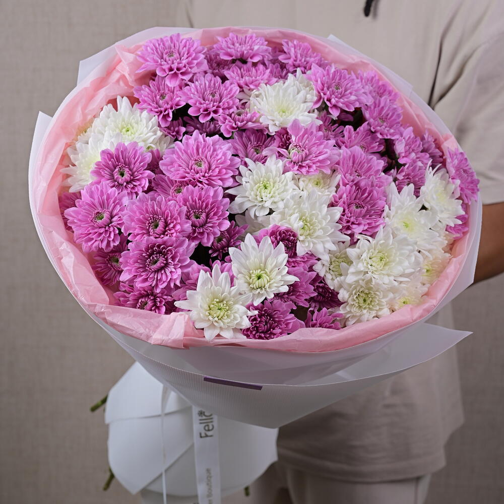 Украсьте чей-то день нашим потрясающим букетом цветов «Фиолетово-кремовое эхо»! Каждый цветок в этой изысканной композиции тщательно отобран за яркие цвета и пышные лепестки, создавая захватывающее зрелище природной красоты. Хризантемы, известные своей долговечностью и очарованием, символизируют радость, любовь и благополучие, что делает этот букет идеальным подарком для любого случая. Характеристики: Гарантия свежести: Букеты собраны и составлены вручную, чтобы обеспечить максимальную свежесть и стойкость. Яркие цвета: Прекрасное сочетание смелых и пастельных оттенков, радующее чувства. Элегантный дизайн: Искусно составленный букет, подчеркивающий естественную красоту каждого цветка. Идеально подходит для любого случая: Идеально подходит для дней рождения, годовщин, праздников или просто для украшения любого помещения. Подробности: Размер букета: высота около 60 см Количество цветов: 11 хризантем премиум-класса Упаковка: упаковано в экологичную бумагу с атласной лентой Подарите своим близким нотку элегантности и радости с нашим букетом из 11 хризантем. Закажите сейчас и насладитесь радостью, даря идеальный цветочный подарок!