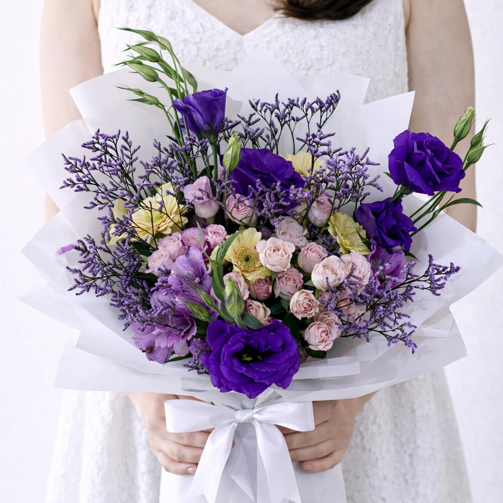 Роскошный букет в насыщенных фиолетовых тонах, составленный из премиальных цветов для элегантного и романтичного образа. В эту композицию входят потрясающие фиолетовые лизиантусы, нежные розовые мини-розы, мягкие хризантемы и красивые фиолетовые статицы в качестве наполнителя, все завернутое в чистую белую упаковку с атласной лентой. Идеально подходит для дней рождения, юбилеев, поздравлений или стильного сюрприза. Лизиантус / Эустома (фиолетовый): 6 стеблей Мини-розы / спрей-розы (розовые): 5 стеблей Хризантемы (жёлтые/кремовые): 4 стебля Статица / лимониум (фиолетовый наполнитель): 4 стебля Альстромерия (фиолетовая/сиреневая): 2 стебля Примечание к покупке: Бесплатная печать поздравительной открытки включена в каждый заказ. (Пожалуйста, напишите текст открытки при оформлении заказа.) Изменение цвета: вы можете запросить смену окраски цветов в соответствии с вашими предпочтениями. Это зависит от наличия и может меняться в зависимости от ежедневных запасов. Дополнительные опции: вы можете добавить такие товары, как: Шары, буквы, цифры, шоколад, духи и подарочные товары (по желанию). Гарантия свежести: мы всегда используем свежие цветы и обеспечиваем максимально возможное качество оформления.