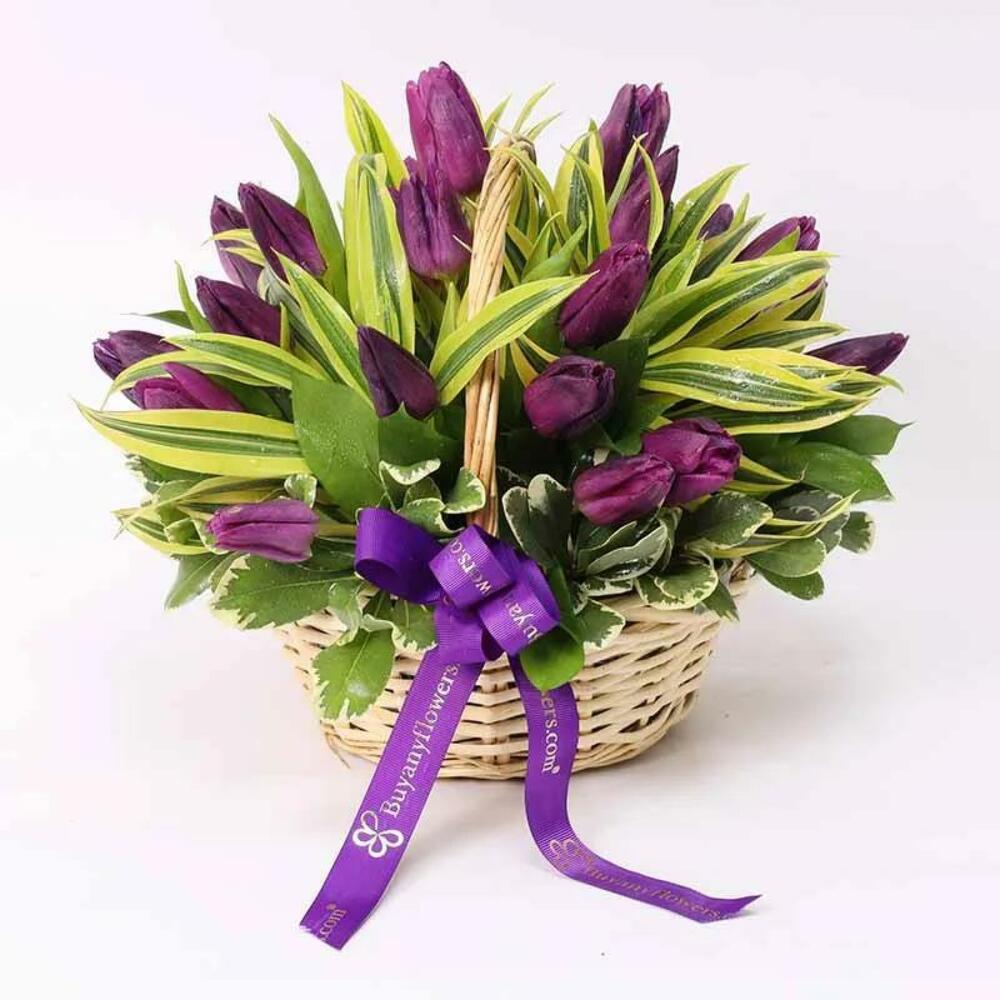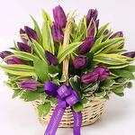 фиолетовые тюльпаны - 25 шт. песня индии - листья - 3 шт. питтоспорум - листья - 2 шт. ручка корзины и ленточный бант - 1 шт.