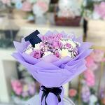 Погрузитесь в гармоничное сочетание 7 белых гвоздик, 10 величественных фиолетовых роз, 3 безупречных хризантем и 2 нежных веточек гипсофилы; все тщательно отобранные нашими профессиональными флористами. Каждая композиция бережно оформляется, создавая красивый букет, который олицетворяет спокойствие и очарование. Эта специально подобранная смесь не только пленяет взгляд, но и воплощает вневременную элегантность и изысканность. Идеально подходит для выражения ваших искренних чувств по любому поводу.