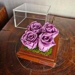 Эта изысканная цветочная композиция включает четыре вечные фиолетовые розы, не вызывающие аллергию, красиво уложенные в деревянную коробку с декоративной зеленью. Коробка элегантно оформлена съёмным прозрачным колпаком, который позволяет выставлять цветы напоказ и любоваться красотой композиции.