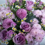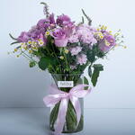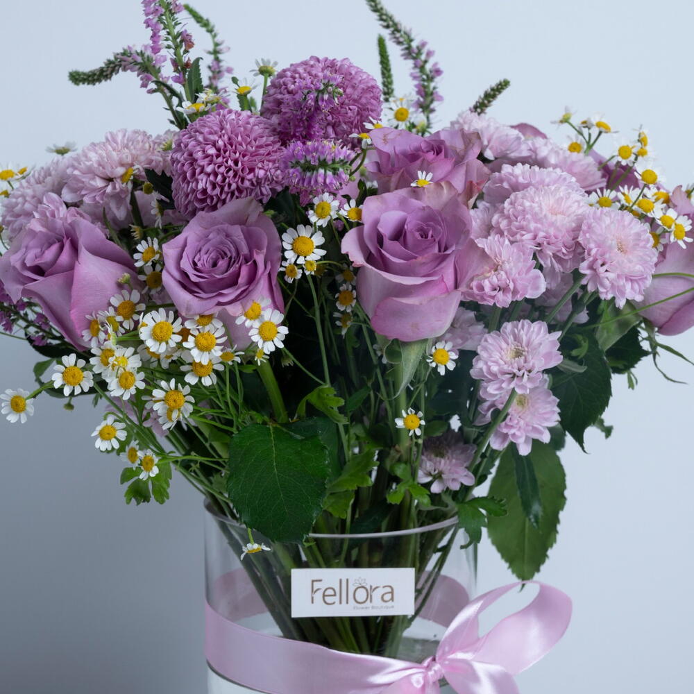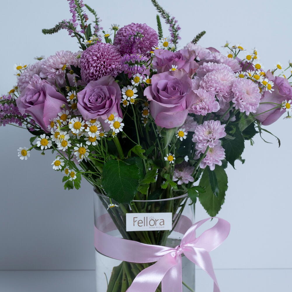 Veronica - 5 шт. Chrysanthemum - 3 шт. purple rose - 10 шт. tanacetum - 5 шт. цилиндрическая ваза - 1 шт.