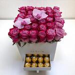 Цветочная коробка с фиолетовыми розами и орхидеями Бельгийские шоколадные конфеты – роскошная подарочная коробка с 200 г Ferrero Rocher