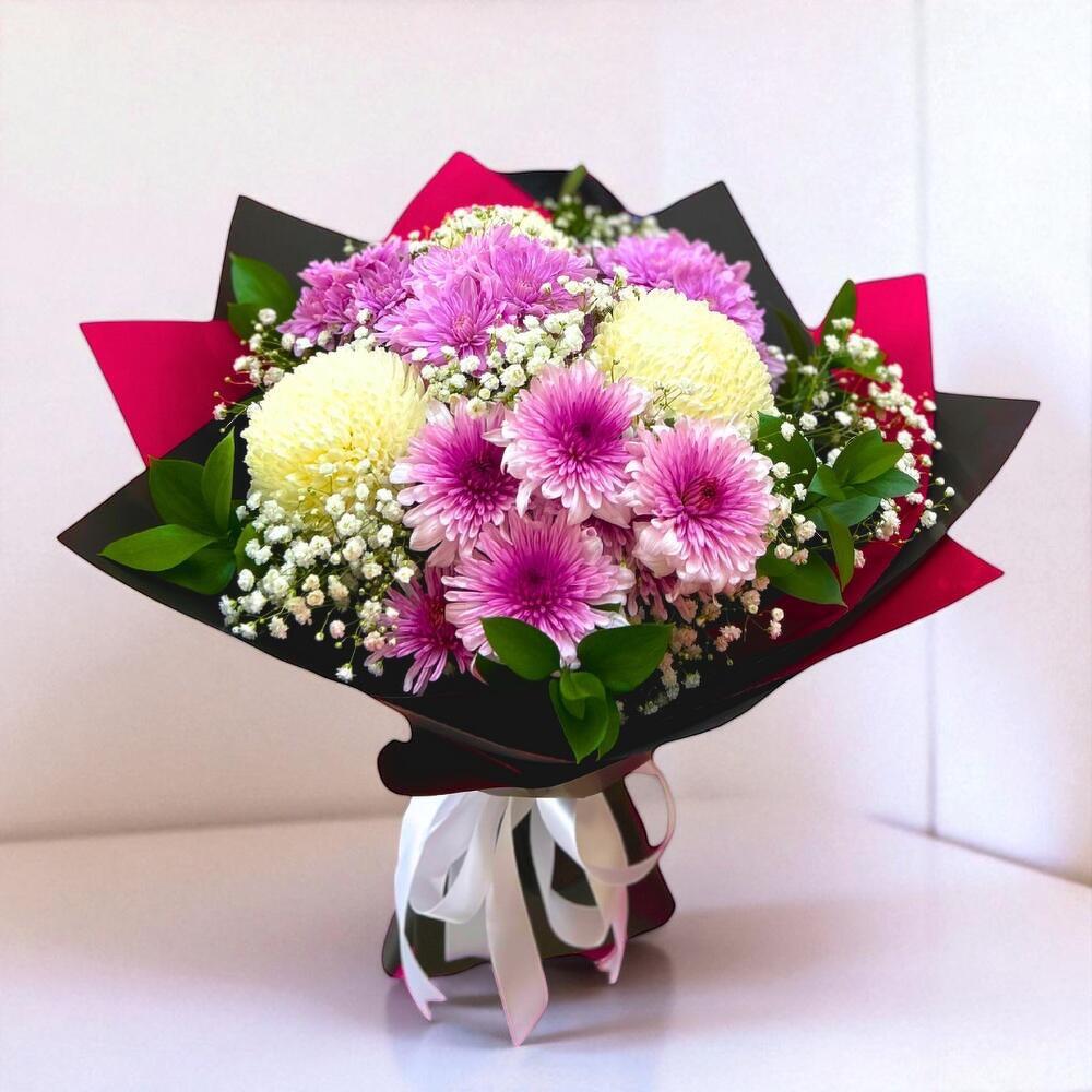 Букет Пурпурный Снег – элегантная композиция из хризантем и гипсофилы