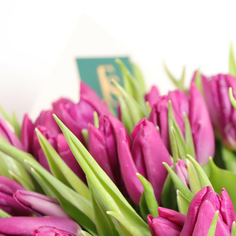 Представляем потрясающий букет пурпурных тюльпанов, идеальное сочетание элегантности и очарования! Этот великолепный букет состоит из смеси насыщенных и ярких пурпурных тюльпанов, отобранных вручную и искусно уложенных нашими опытными флористами. Тюльпаны известны своей красотой и грацией, а насыщенный пурпурный оттенок придаёт общему виду букета нотку изысканности.