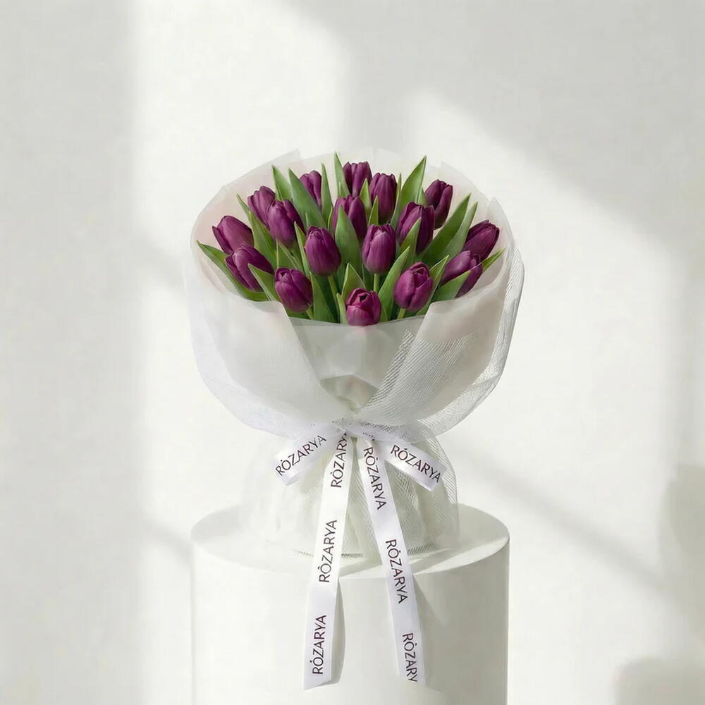 Безукоризненная моно-композиция из премиальных фиолетовых тюльпанов в современной архитектурной обёртке. Уложена слоями дизайнерской белой сетки и завершена фирменной лентой Rozarya. Совершенное выражение минималистской роскоши и глубокой, вдохновлённой весной элегантности. • Пожалуйста, обратите внимание: поскольку цветы являются натуральным продуктом, фактические цвета могут незначительно отличаться от цифровых изображений из‑за сезонного роста и условий освещения. Мы гарантируем, что общий стиль, премиальное качество, а также свежесть вашей композиции всегда будут сохранены.