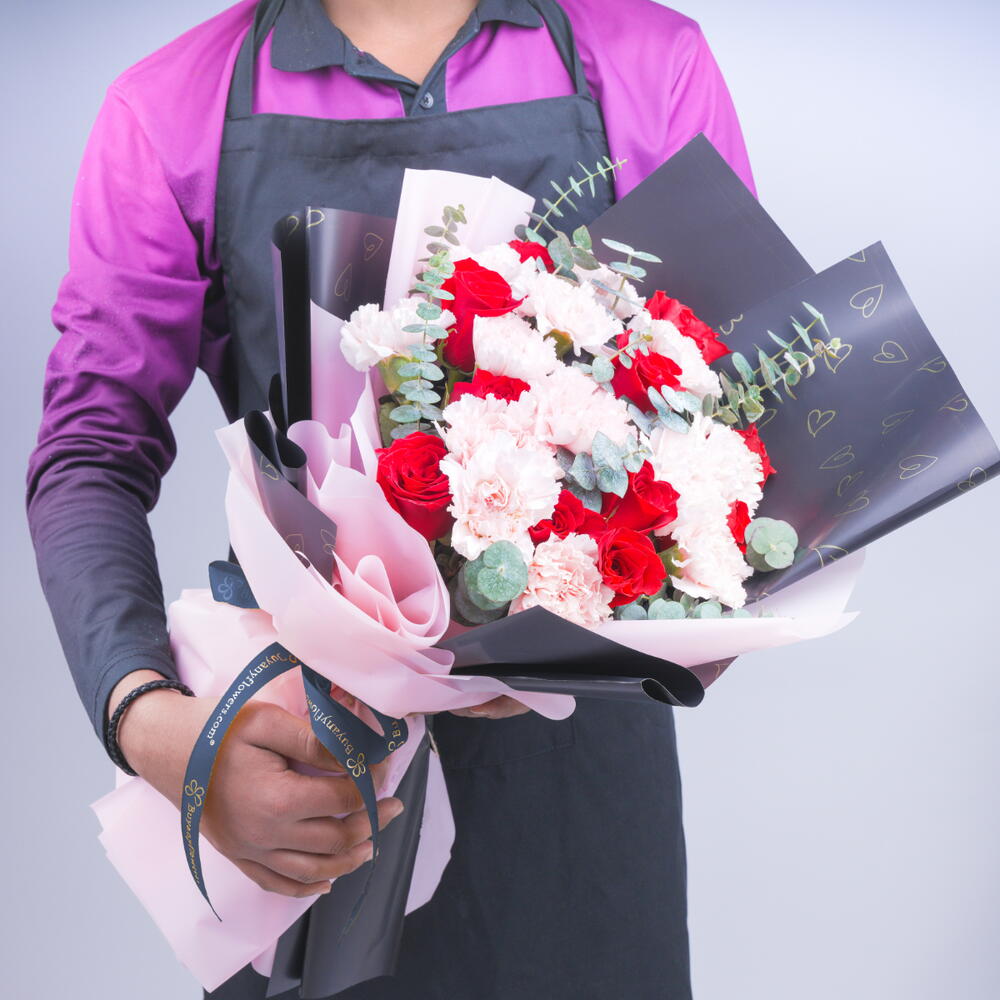 11 красных роз, 10 розовых гвоздик, листья: 4-5 стеблей Parvifolia, упаковано в черно-розовую упаковку в форме сердца, перевязано жёлтой лентой бантом