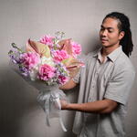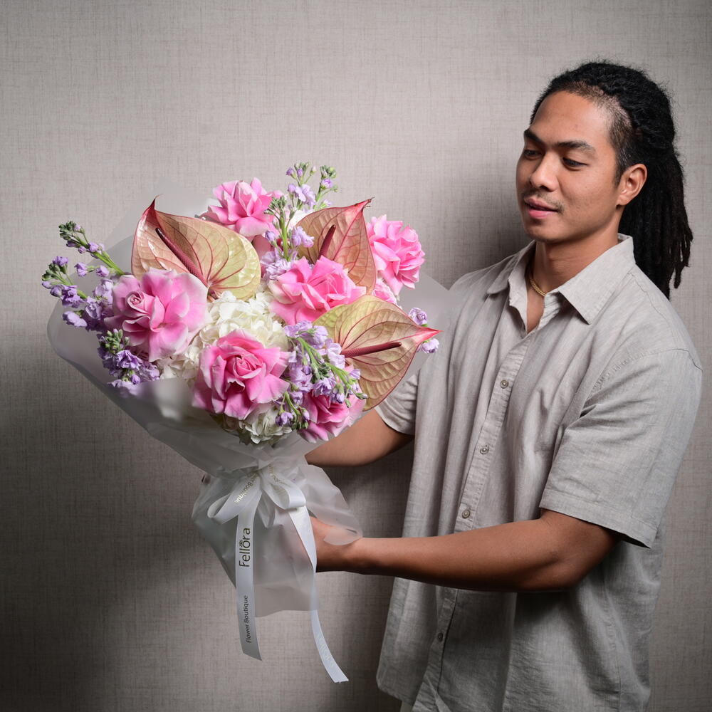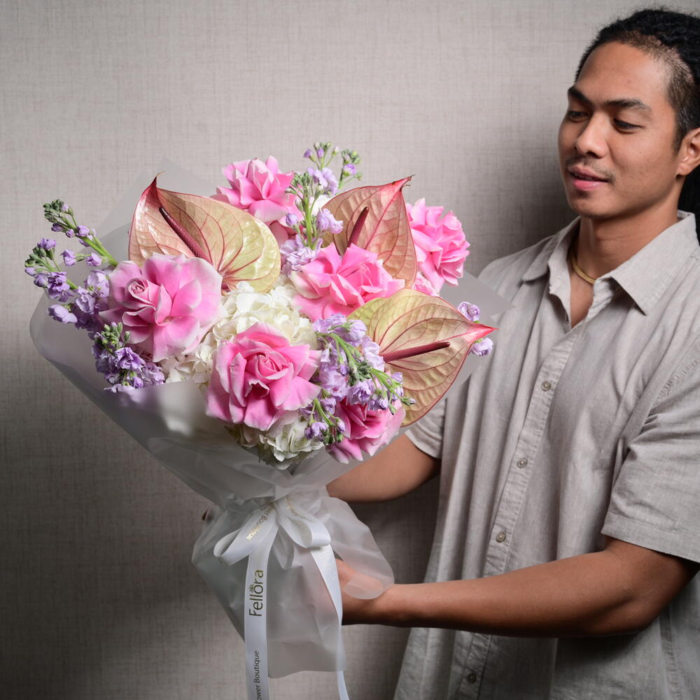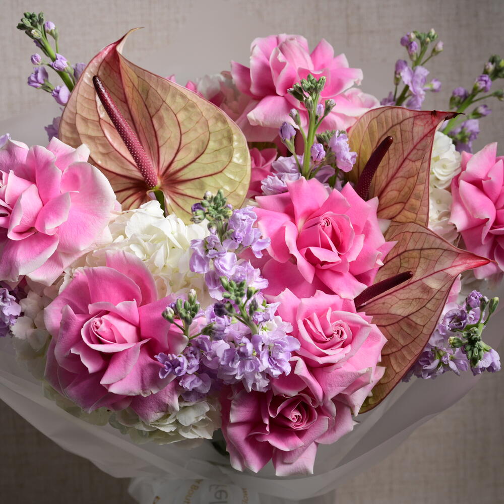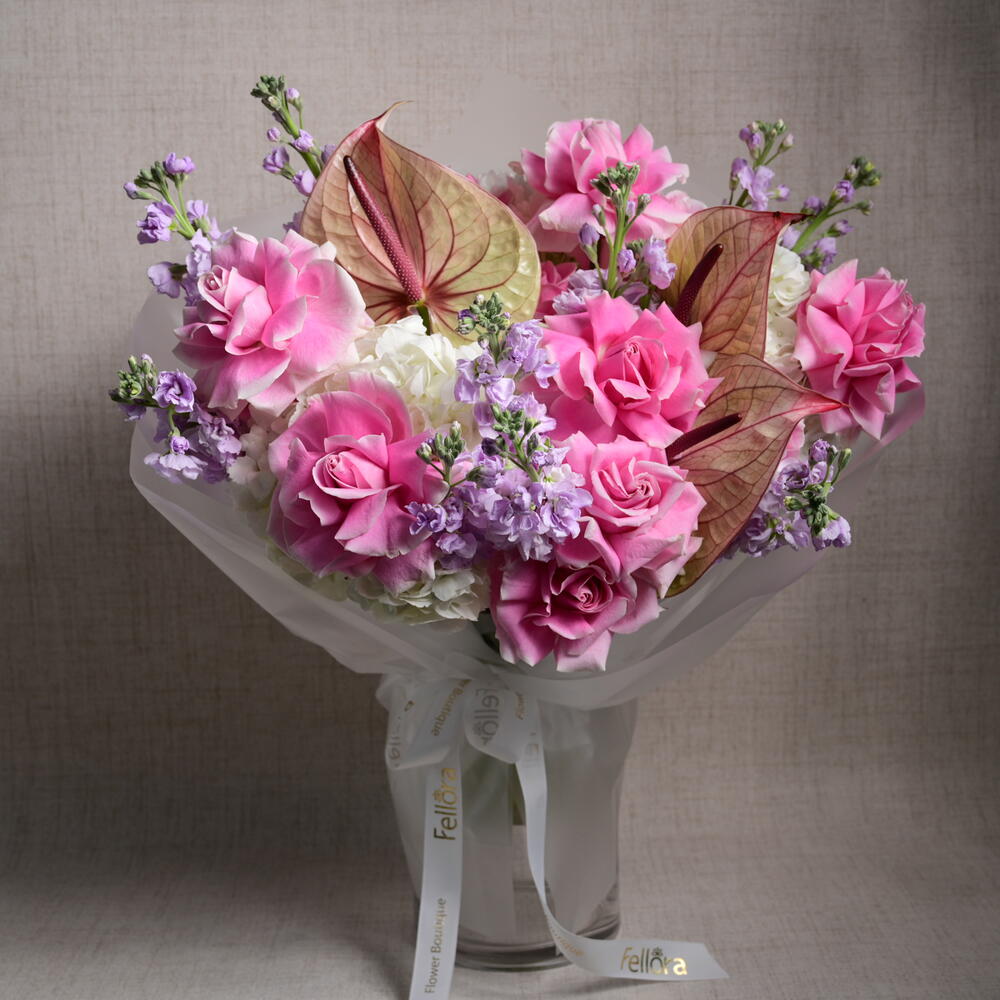 Королевская цветочная композиция из 11 роз сорта «Розита», 9 маттиол, 5 гортензий и 3 антуриумов, элегантно оформленная, чтобы подчеркнуть роскошь и изящество. Этот букет размером 45 см в ширину и 55 см в высоту — настоящее воплощение красоты и изысканности.