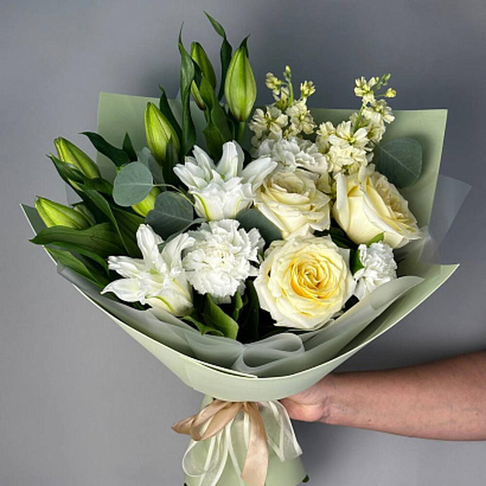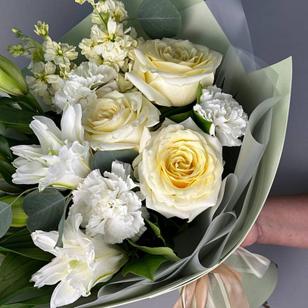 white carnations - 3 шт. mathiola - 2 шт. Колумбия - 2 шт. cream white roses - 3 шт. двойные лилии - 2 шт.