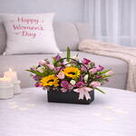 Pink rose - 5 шт. sunflowers - 2 шт. white tulip - 3 шт. pink tulips - 5 шт. purple tulip - 3 шт. розовый воск - 1 шт. темно-пурпурная роза - 7 шт. черная сумка - 1 шт.