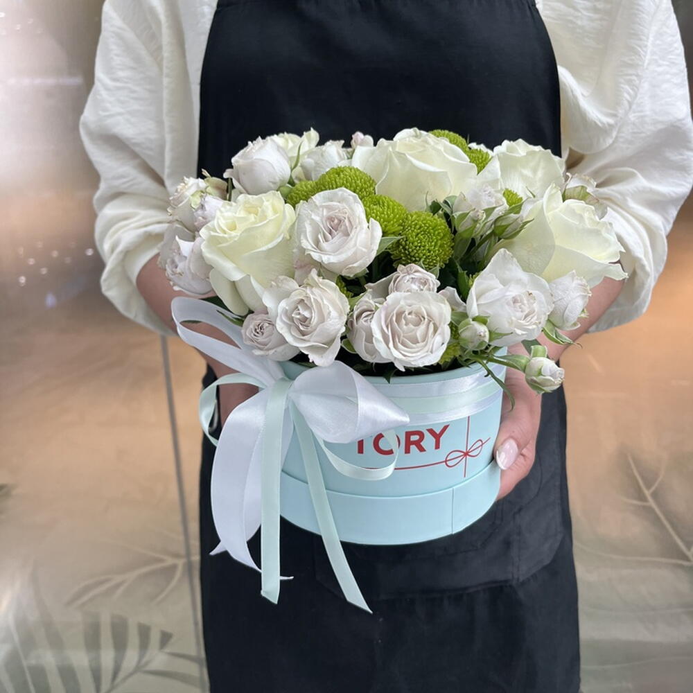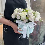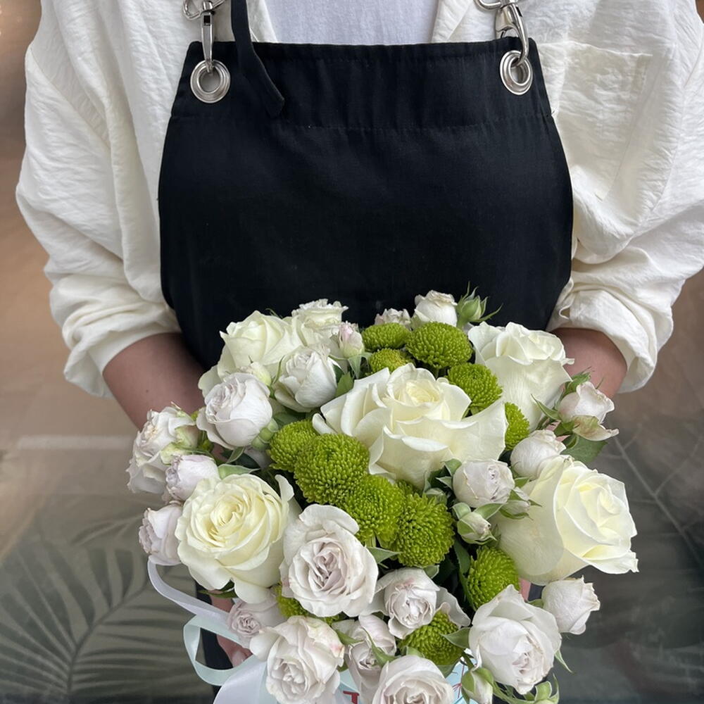 Composition: Rose white - 5, Spray Rose Odilia light pink - 5, Chrysanthemum spray - 2 Sizes: WIDTH - 17CM; HEIGHT - 20CM; LENGTH - 20CM; (including packaging) Размер: 17 x 20 x 20 см