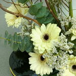 Эта элегантная цветочная композиция выполнена в чистой монохромной палитре из кремово-белых гербер и классических роз, дополненных нежными веточками гипсофилы и пышной зеленью. В центре композиции — декоративная табличка с надписью «Рамадан Мубарак», выполненной художественной арабской каллиграфией. Композиция обрамлена ивовыми ветвями и включает в себя изящную черную вазу, создавая умиротворяющий и утонченный знак в честь священного месяца.