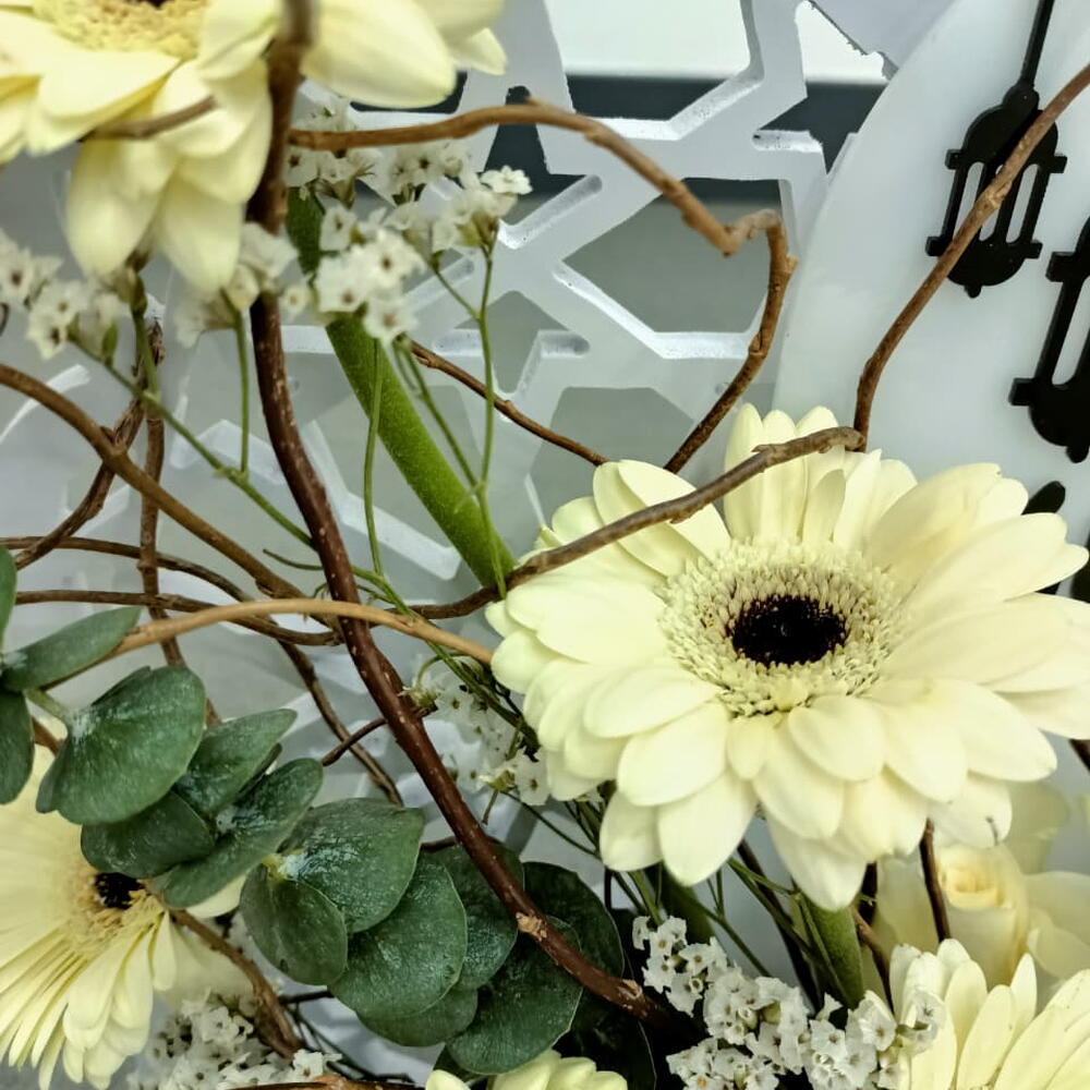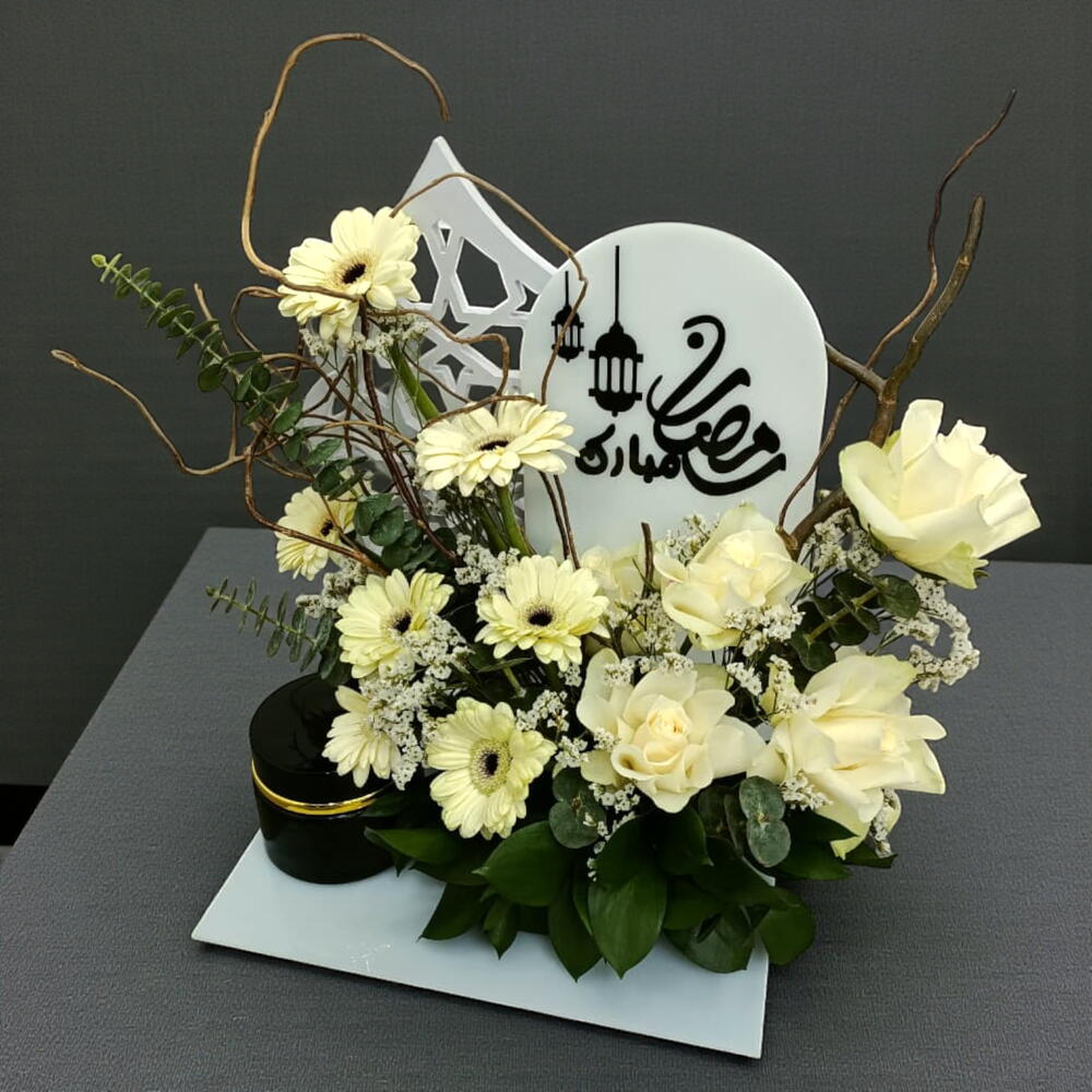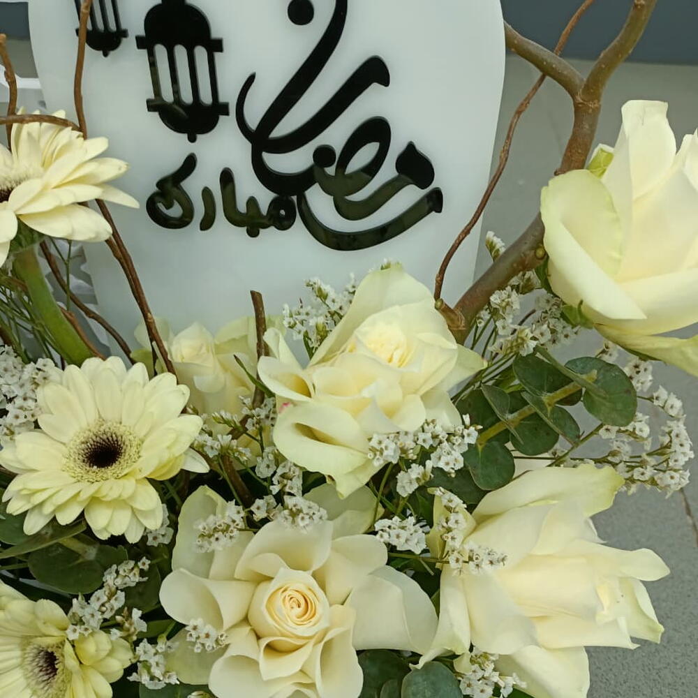 Эта элегантная цветочная композиция выполнена в чистой монохромной палитре из кремово-белых гербер и классических роз, дополненных нежными веточками гипсофилы и пышной зеленью. В центре композиции — декоративная табличка с надписью «Рамадан Мубарак», выполненной художественной арабской каллиграфией. Композиция обрамлена ивовыми ветвями и включает в себя изящную черную вазу, создавая умиротворяющий и утонченный знак в честь священного месяца.