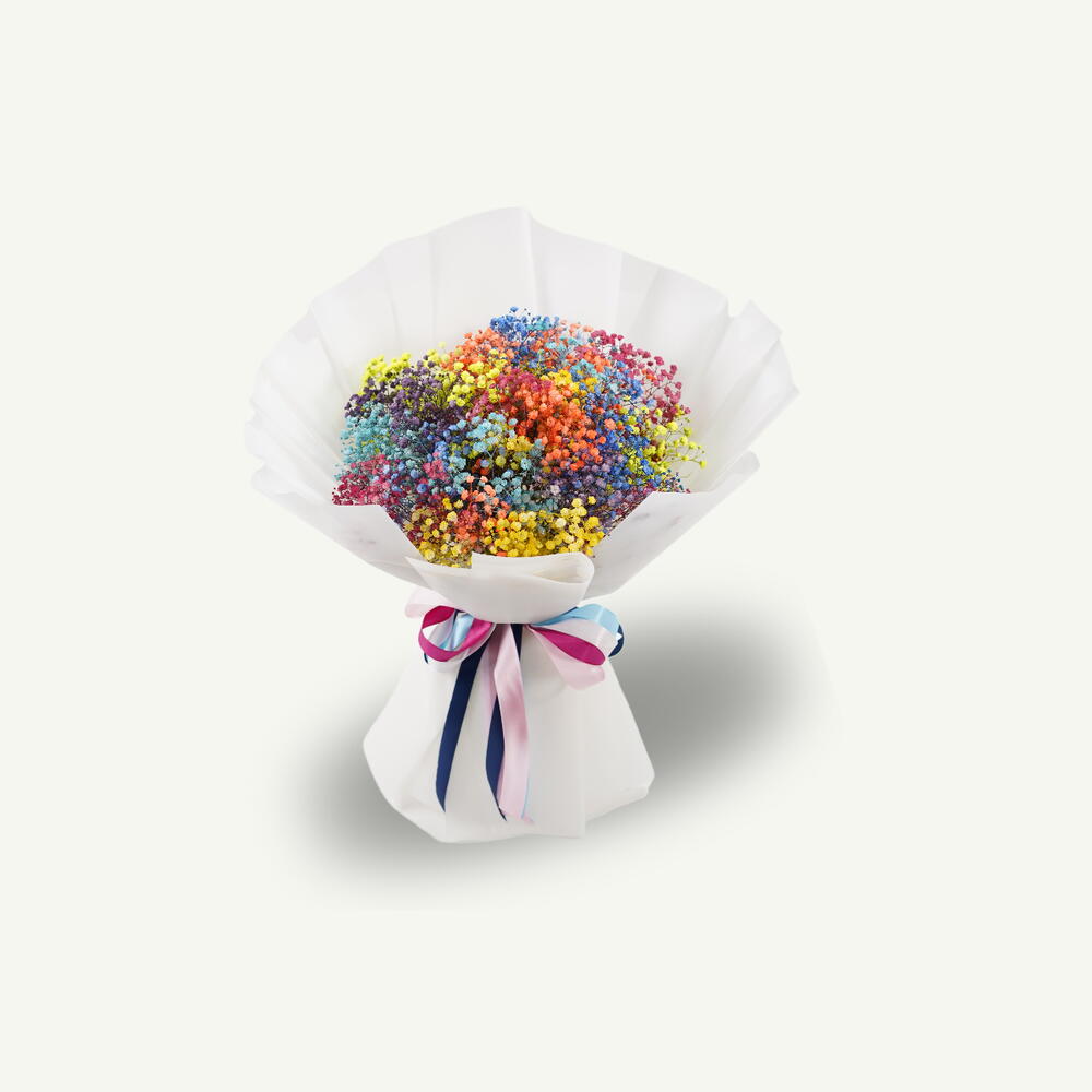 Букет, собранный вручную из радужной гипсофилы, бережно оформлен в белую обёртку для яркого и радостного эффекта.