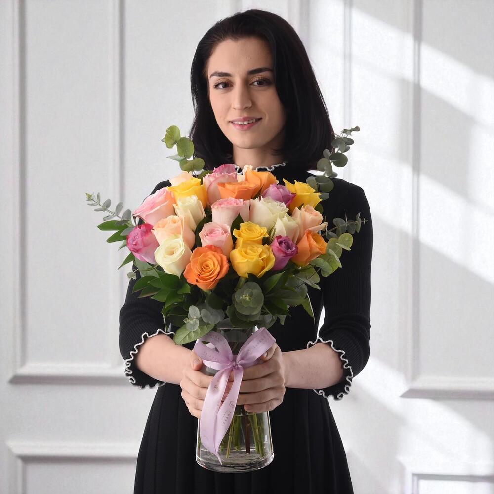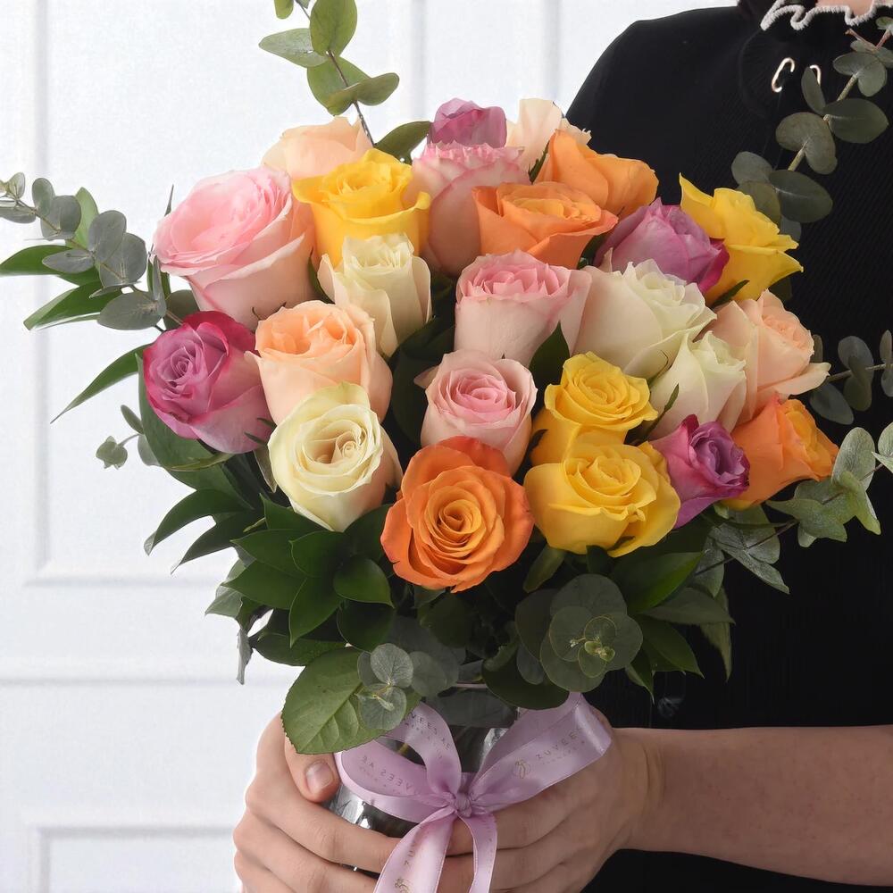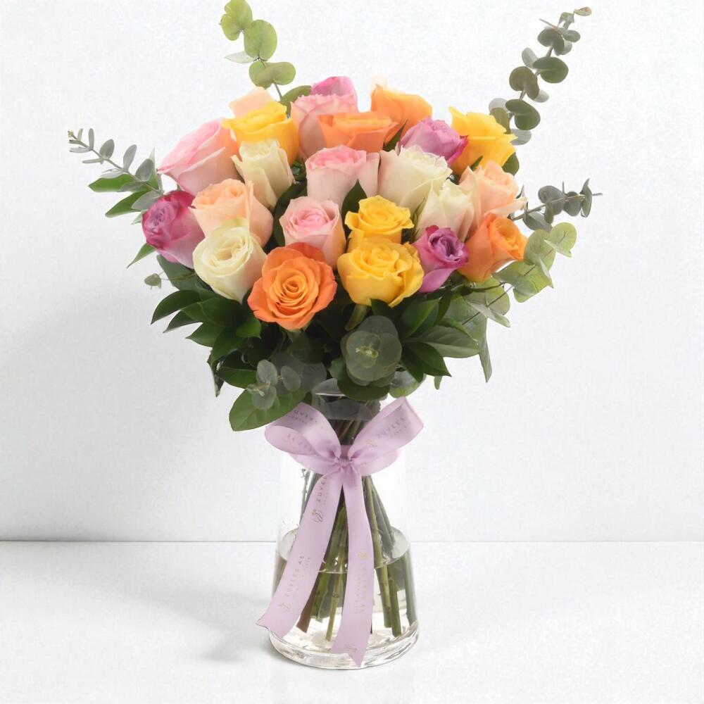 Infuse any space with color, elegance, and heartfelt sentiment through our Rainbow Blush Multi-Rose Vase — a dazzling celebration of love and joy in every hue. This radiant bouquet brings together 24 premium roses in a rich medley of shades: 4 Orange, 4 White, 4 Pink, 4 Yellow, 4 Peach, and 4 Purple, each symbolizing joy, friendship, admiration, and warmth. Accentuated with 5 stems of Ruscus and 3 stems of aromatic Eucalyptus, the arrangement is nestled in a sleek clear glass vase, tied gracefully with a pastel satin ribbon for a polished finish. Whether youre celebrating a milestone or simply sending smiles, this bouquet brings sunshine and sophistication with every petal.