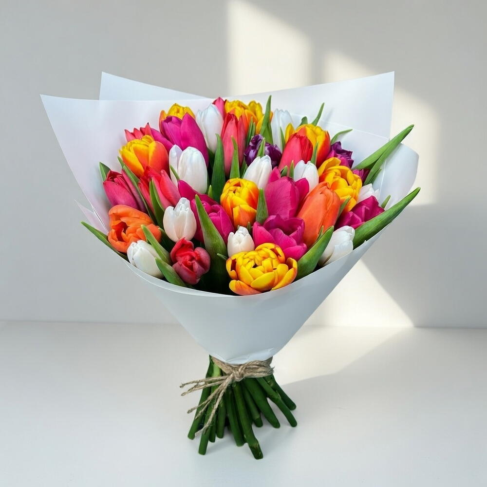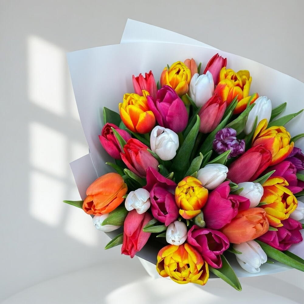 Rainbow Delight — это яркий букет из сорока пяти свежих тюльпанов, составленный в гармонично сбалансированной смеси красных, жёлтых, розовых, белых и фиолетовых оттенков. Гармоничное распределение цветов создаёт живую, но элегантную композицию, наполненную положительной энергией. Каждый оттенок вносит своё значение — любовь, счастье, восхищение, искренность и вдохновение — в результате получается букет, излучающий радость и тепло. Щедрый объём придаёт роскошный вид, сохраняя при этом лёгкий, весенний характер. Идеально подходит для дней рождения, юбилеев, Международного женского дня, выпускных, семейных торжеств или трогательного сюрприза. Эта яркая композиция создана, чтобы сделать любой день особенным и запоминающимся. Аккуратно упакованный и оформленный с утончёнными завершающими штрихами, этот букет дарит свежесть, цвет и настоящий весенний дух в каждом стебле.