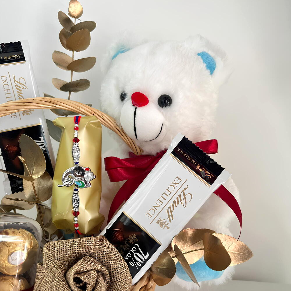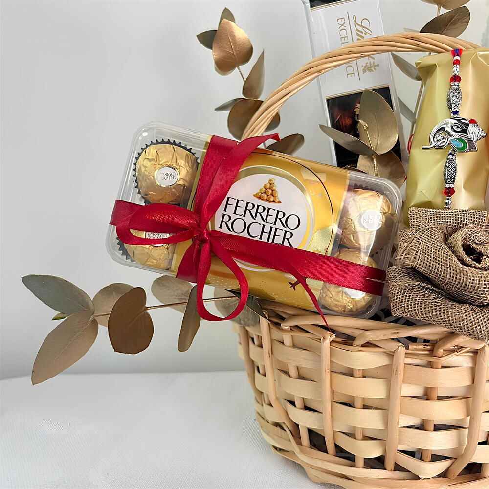Basket - 1 шт. teddy - 1 шт. eucalyptus leaves - 2 шт. коробка Ferrero Rocher 16 шт. - 1 шт. швейцарская шоколадная плитка lindt (70г) - 2 шт.