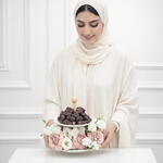 Изящная двухъярусная композиция с капучино-розами, белыми кустовыми гвоздиками и лизиантусами, дополненная премиальными натуральными финиками для деликатного акцента к Рамадану.