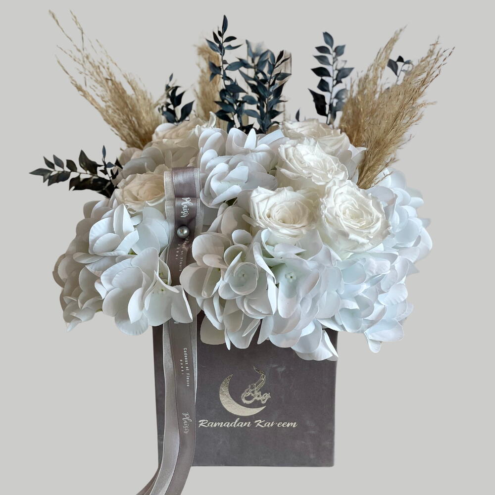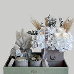 candle - 1 шт. пампасы - 5 шт. dry ruscus - 4 шт. коробка шоколадных конфет - 1 шт. коробка с финиками (8x8см) - 100 гр. Украшение для Рамадана - 1 шт. искусственная гортензия - 5 шт. вечные розы - 7 шт.