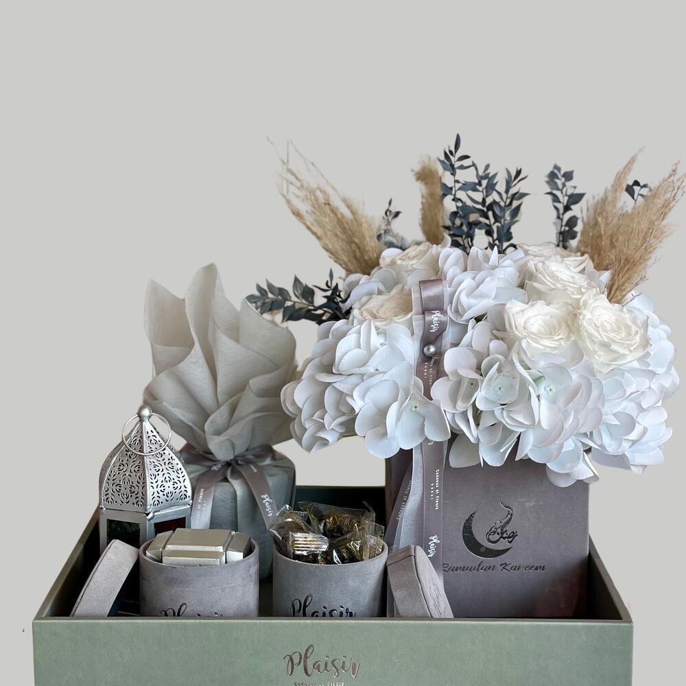 Идеальное предложение к Рамадану для этого святого месяца. Роскошный серый подарочный поднос к Рамадану состоит из красивой долговечной композиции в серой коробке Ramadan Kareem (15x15cm), премиальных фиников, вкусной коробки шоколадных конфет, серой свечи Plaisir и красивого украшения, вдохновлённого Рамаданом. Этот впечатляющий поднос обязательно впечатлит получателя своей роскошью! Как прекрасный способ пожелать им всего наилучшего. Берегите себя, Рамадан Карим.