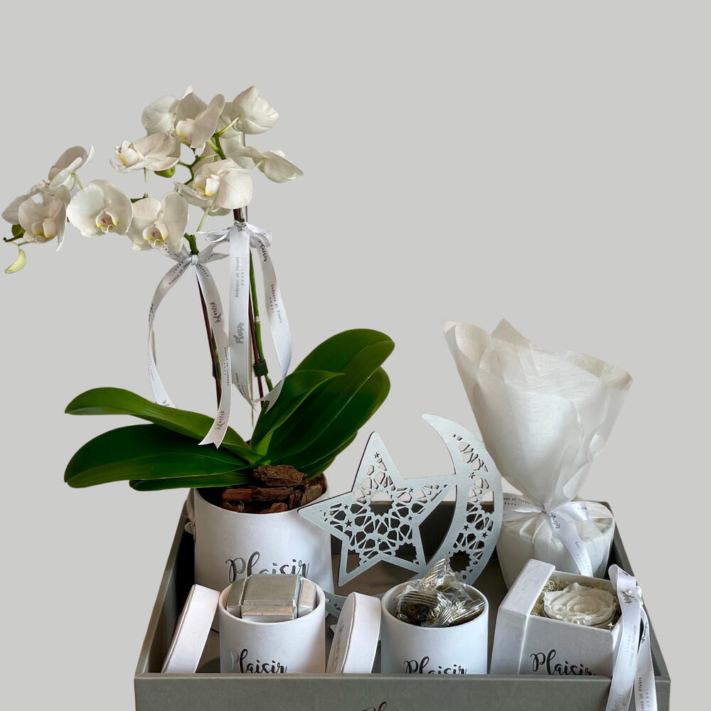 Идеальное подношение к Рамадану в этот священный месяц. Роскошный белый поднос для подарков к Рамадану включает в себя белую мини-орхидею, белую одиночную инфинити-розу, финики премиум-класса, вкусную коробку шоколада, белую свечу Plaisir и красивое украшение, вдохновлённое Рамаданом. Этот впечатляющий поднос обязательно поразит получателя своим великолепием! Как замечательный способ пожелать им всего хорошего. Берегите себя, Рамадан Карим.