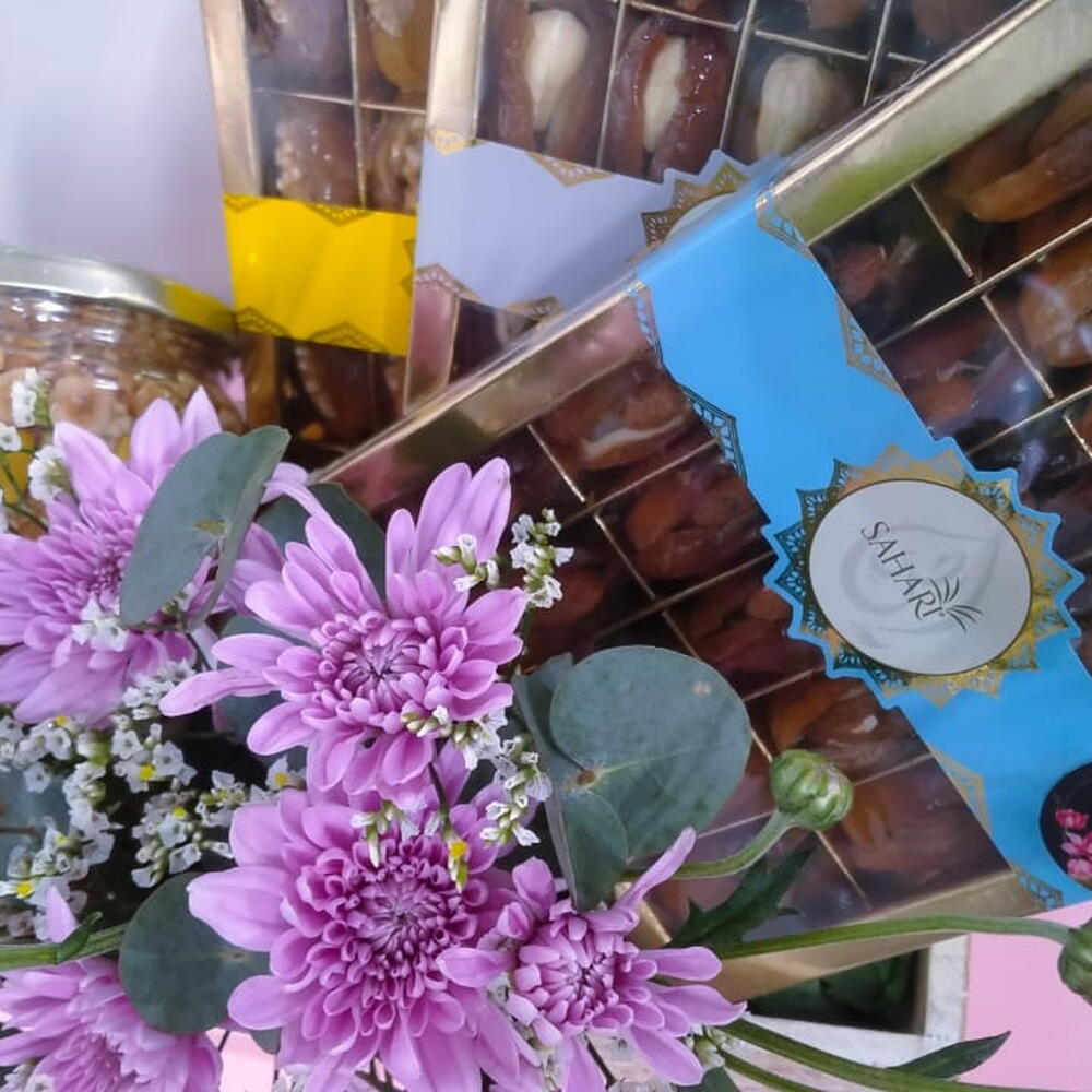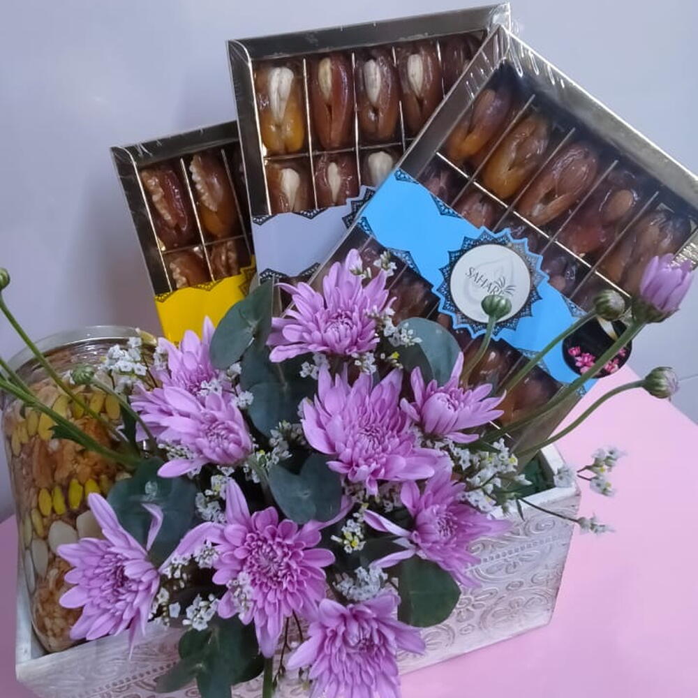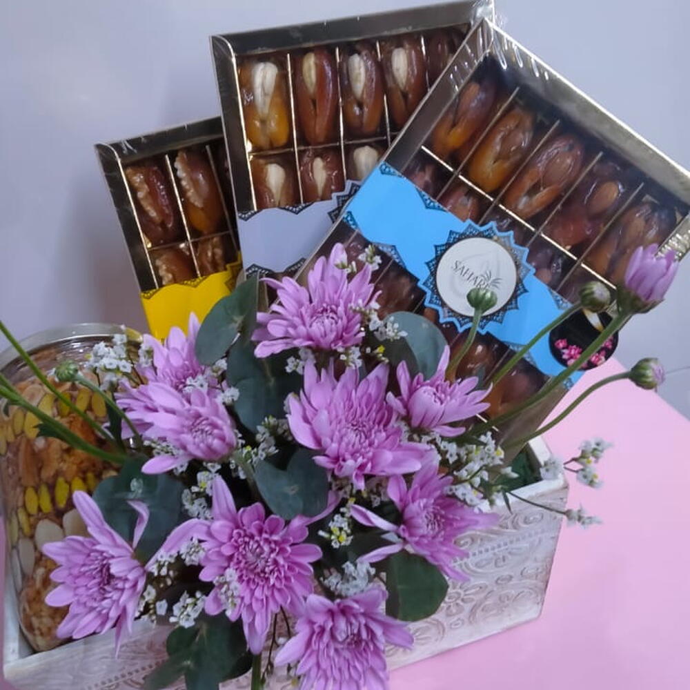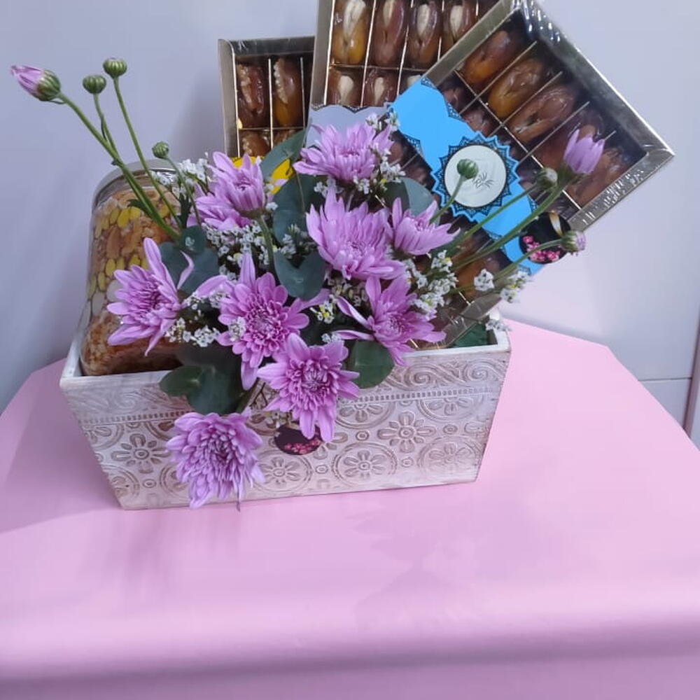 Chrysanthemum - 2 шт. wood basket - 1 шт. золотая смесь орехов - 720 гр. финики с миндалём - 200 гр. финики с кешью - 200 гр. финики с грецким орехом - 200 гр.