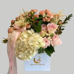 Spray rose - 4 шт. Hydrangea - 2 шт. astilbe - 3 шт. шелковая лента - 1 шт. ohara rose - 7 шт. лист рускуса - 2 шт.