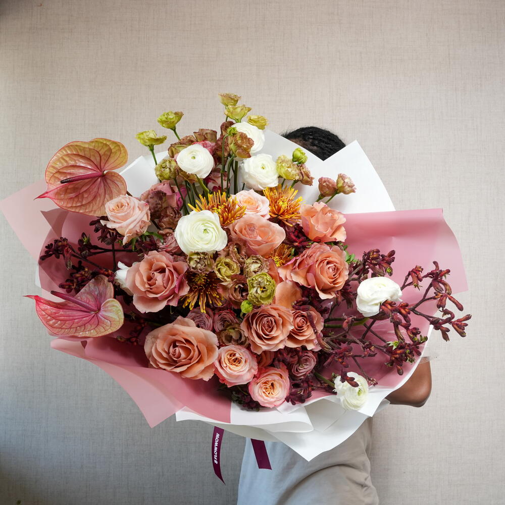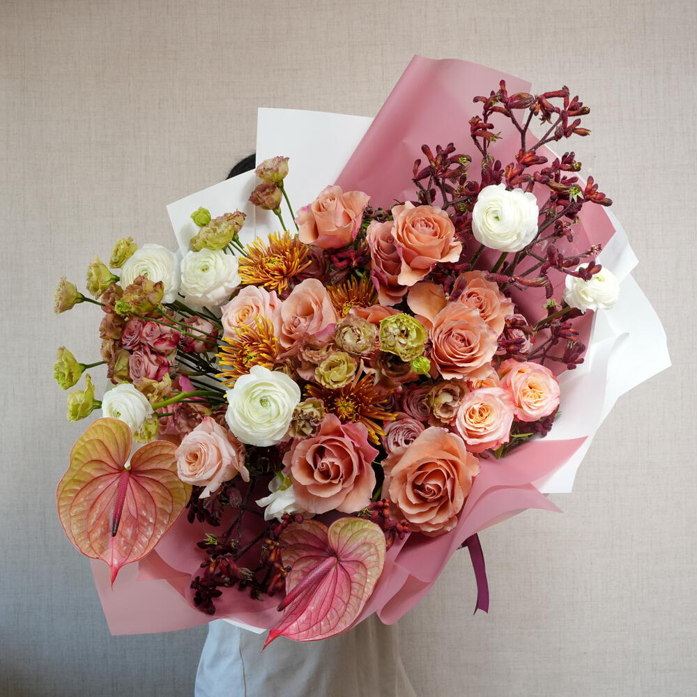 Eustoma - 10 шт. Chrysanthemum - 5 шт. Антуриум - 2 шт. anigozanthus - 5 шт. ranunculus - 9 шт. розы (стебли) - 10 шт. спрей-розы (стебли) - 10 шт.
