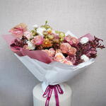Элегантный букет смешанных цветов – потрясающая композиция, включающая 10 роз и 10 кустовых роз (на каждом стебле по 3–4 нежных цветка), идеально подходит в подарок или для особых торжеств.