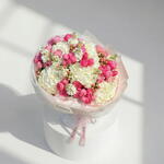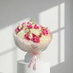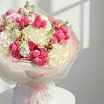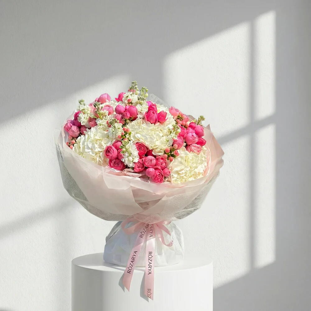 A soft and elegant bouquet in white and bright pink shades, arranged with lush hydrangea, delicate ranunculus, charming spray roses, white matthiola, and pink hypericum berries. Fresh, feminine, and eye-catching, this bouquet is perfect for birthdays, Mother’s Day, and special celebrations • Please Note: As flowers are natural products, actual colors may vary slightly from digital images due to seasonal growth and lighting conditions. We guarantee that the overall style and premium quality as well as freshness of your arrangement will always be maintained.