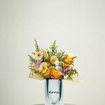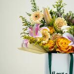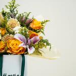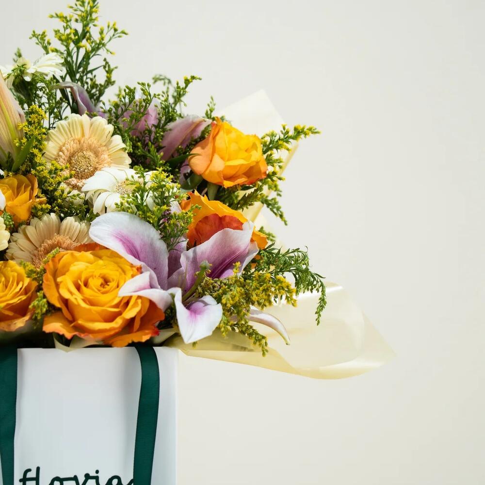 Solidago - 5 шт. orange rose - 3 шт. лилии - 3 шт. гербера персиковая - 3 шт.