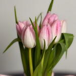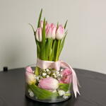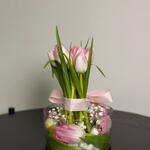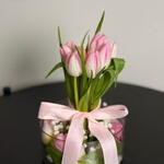 В этой композиции представлены нежные розовые тюльпаны, красиво расположенные в прозрачной круглой вазе. Мягкие розовые тона тюльпанов символизируют любовь, элегантность и нежные чувства. Цветы аккуратно оформлены со свежей зеленью и мелкими белыми соцветиями гипсофилы, создавая естественный и изящный вид. Прозрачная ваза украшена белыми декоративными камнями и перевязана мягкой розовой лентой, что добавляет нежный и элегантный штрих. Это флористическое изделие идеально подходит для подарка, чтобы удивить кого-то особенного или просто добавить штрих красоты в любое пространство. Ее минималистичный, но элегантный дизайн делает ее прекрасным выбором для дней рождения, романтических жестов или продуманных сюрпризов.